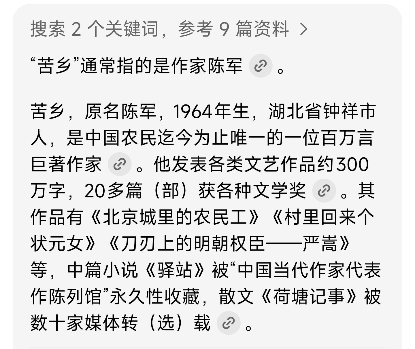 几个月前,我因为要填一张表,就上网搜“苦乡”,打算复制一份简介算了。因为网上到处都是关于我的故事、生平介绍、创作简历。这一次却发现百度百科的“苦乡”变成了山东人李胜。我发表在中国作家网上反映我们钟祥革命斗争史的长篇小说《火》成了他的代表作,并大书特书。下面的图书我的作品《北京城里的农民工》和《刀刃上的明朝权臣——严嵩》也成了他的作品,让我哭笑不得。我尝试反馈信息,说他们搞错了,但没有用。不信大家上网搜“苦乡”,百度百科“苦乡”现在仍然是这个李胜。