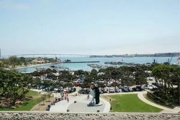 行至港区的纪念广场,一座栩栩如生的塑像吸引了所有人的目光——那正是“胜利之吻”的复刻:水兵身着挺括的制服,双臂紧紧搂着身旁的女护士,俯身献上深情一吻,护士的双手轻搭在水兵肩头,脸上满是释然的笑容。阳光洒在塑像上,仿佛为这定格的瞬间镀上了一层温暖的光晕。我们纷纷在塑像下拍照留念,游友们举着相机,捕捉着塑像眉宇间的狂喜与温柔,也记录下我们与这段历史对话的瞬间。