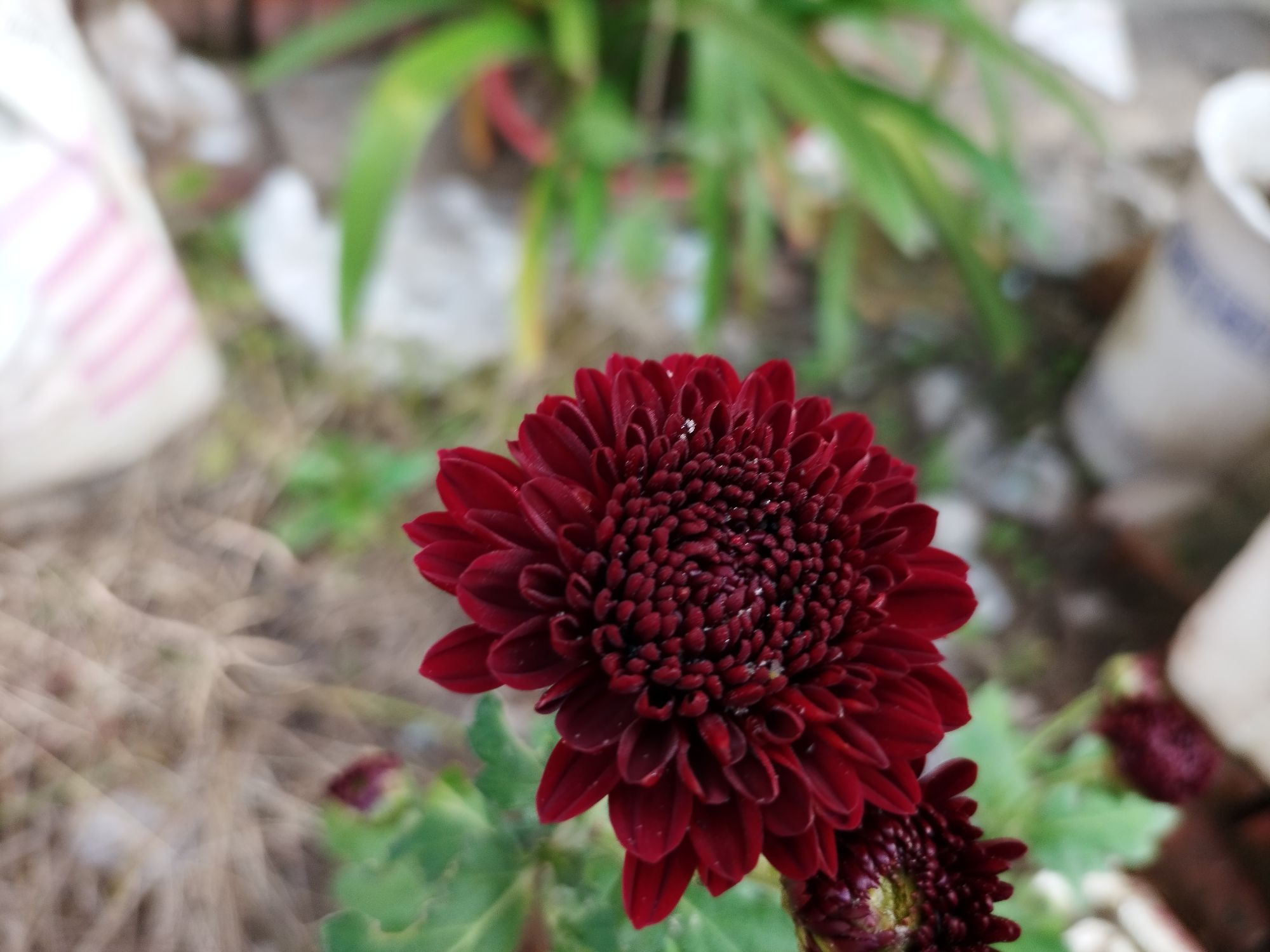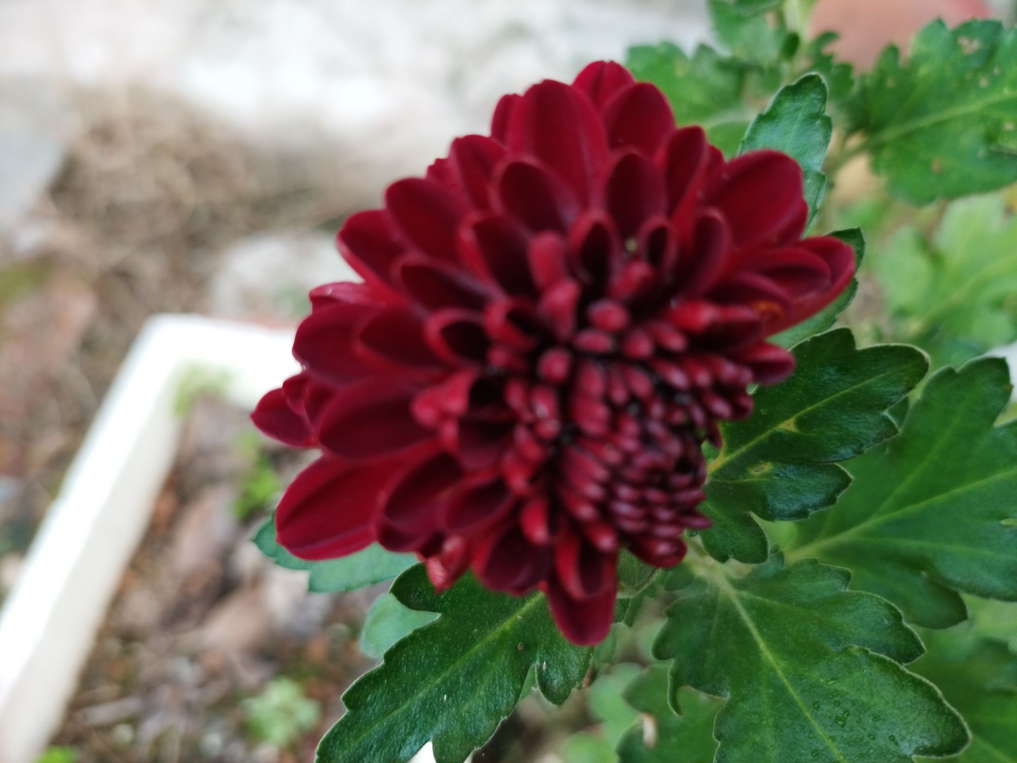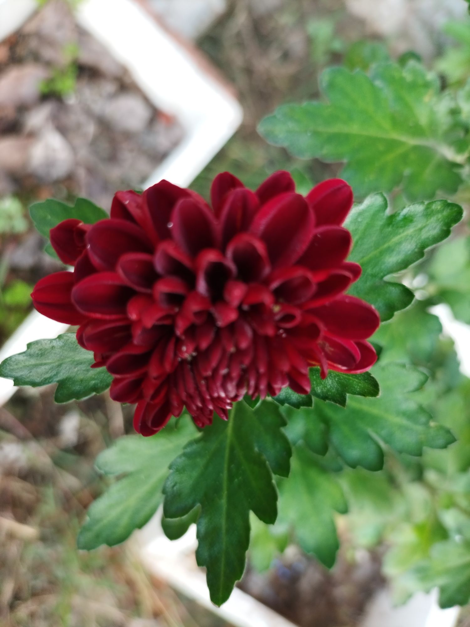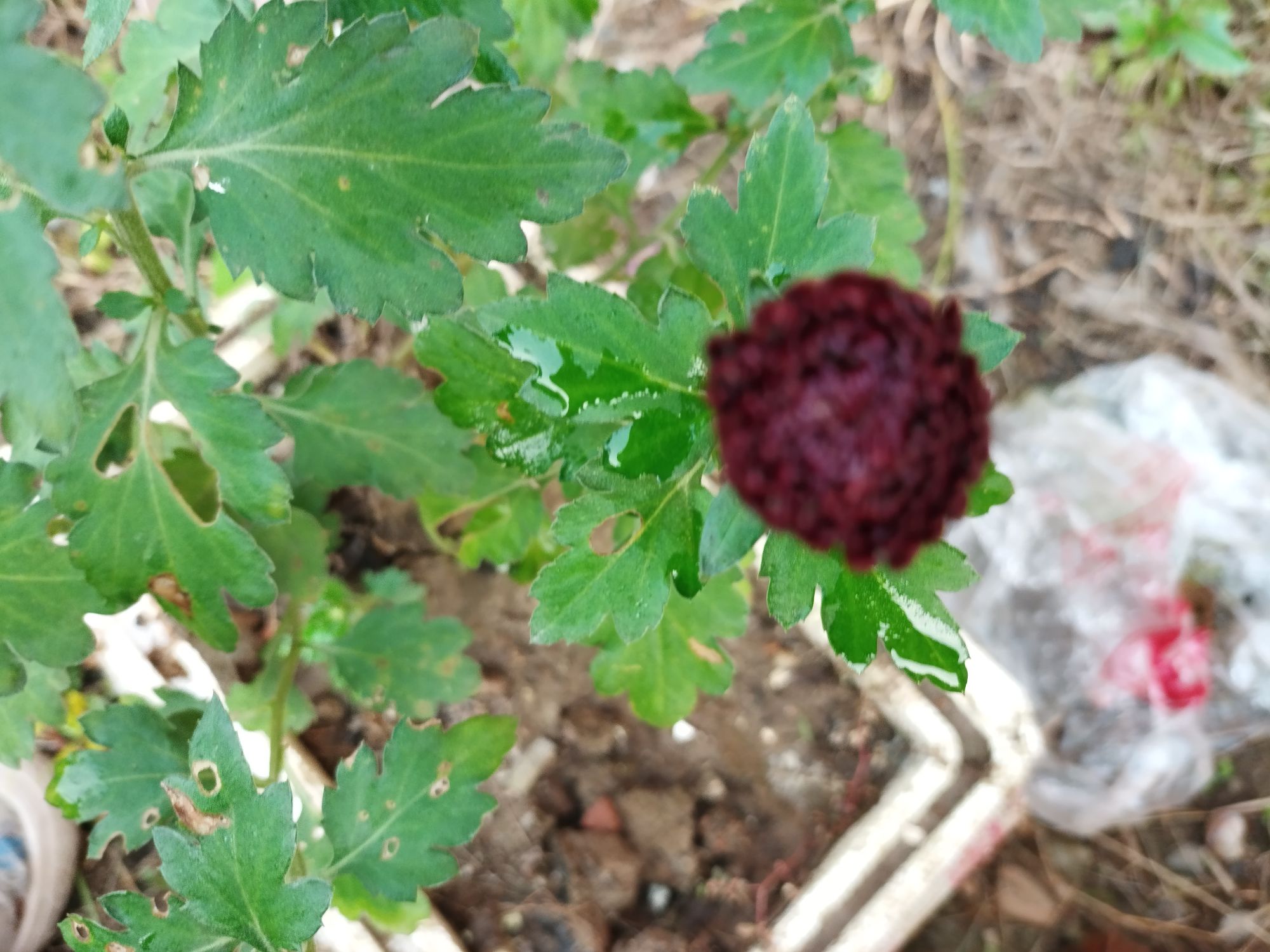 这是墨菊(或深色重瓣菊花),其核心特征与背景信息如下: 1. 形态特征 - 花朵为深紫红色(接近墨色),花瓣重瓣且排列紧密,呈球形或半球形; - 叶片为典型的菊花叶形,边缘有锯齿,质感厚实。 2. 生长特性 - 属于秋菊类,耐寒性较强,通常在秋季开花; - 常作为盆栽观赏花卉,养护难度较低,适合庭院或室内摆放。 3. 文化寓意 - 在中国文化中,菊花象征高洁、长寿,而墨菊因颜色独特,也常被视为珍稀品种,兼具观赏与文化价值。 需要我帮你整理墨菊的日常养护要点(如光照、浇水等)吗?