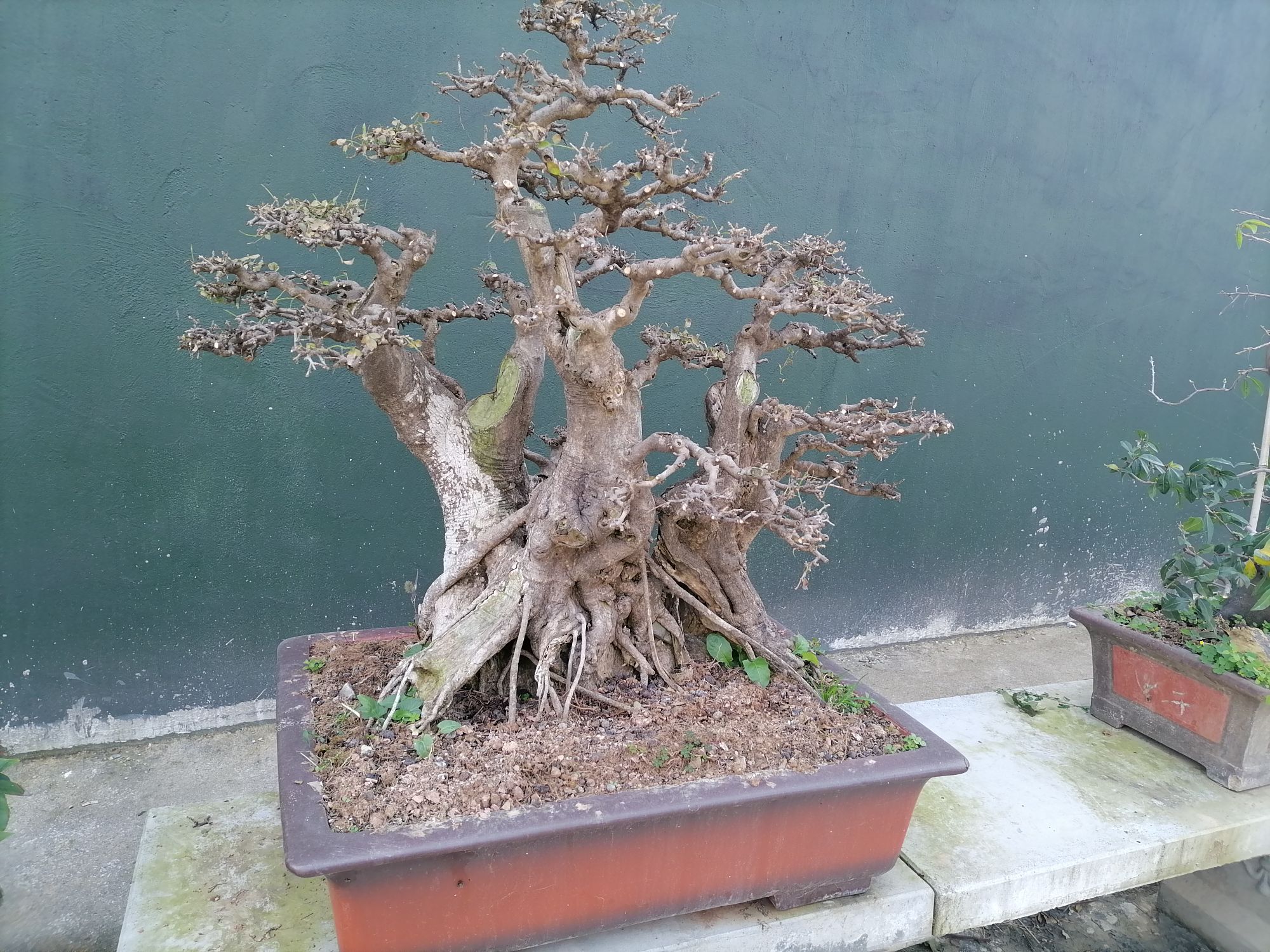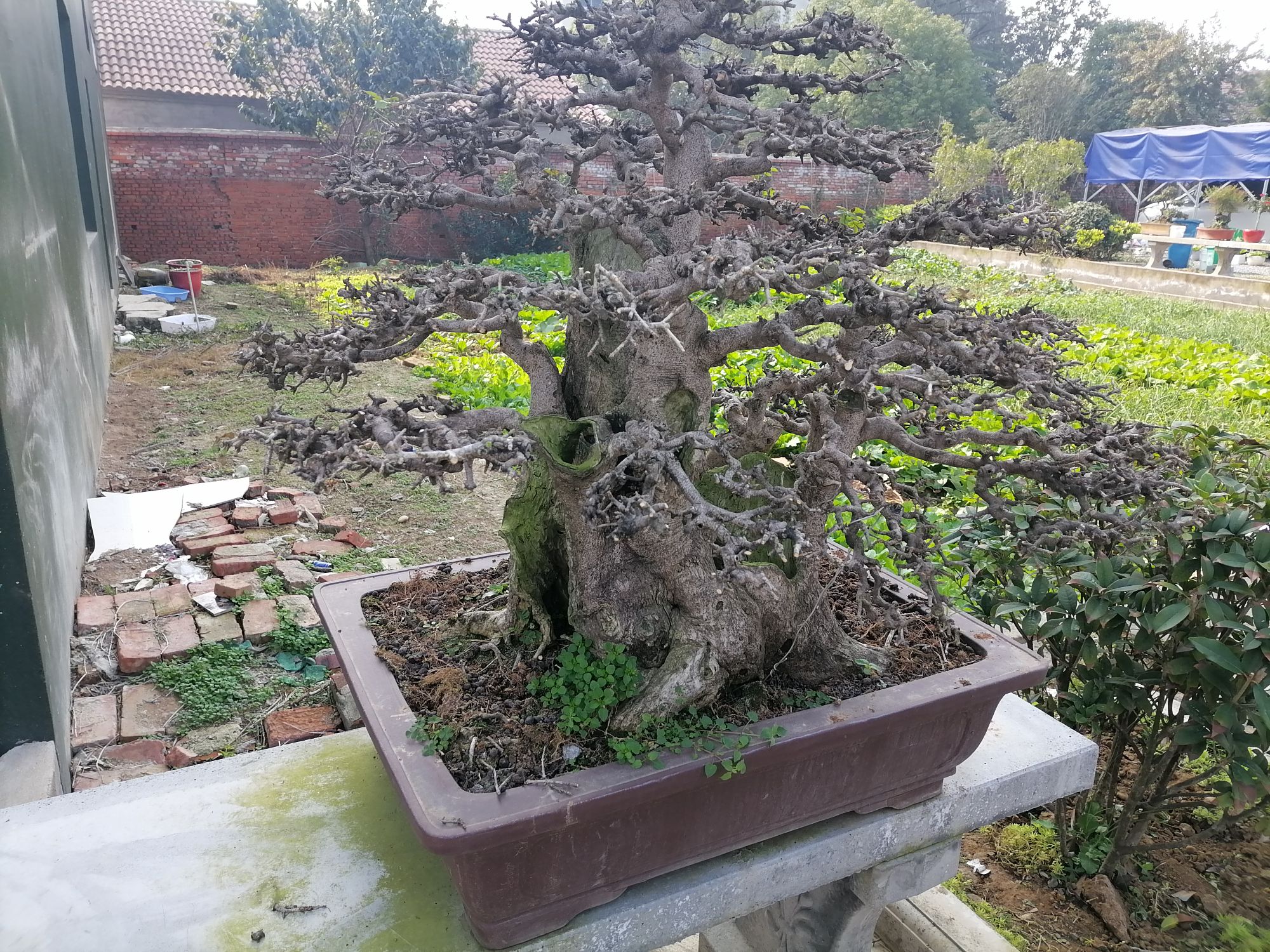 右侧地势开阔,足停数车;外围盆景别具野趣,居中者垂着长长气根,直探地面,俨然一派深山幽谷意境。
