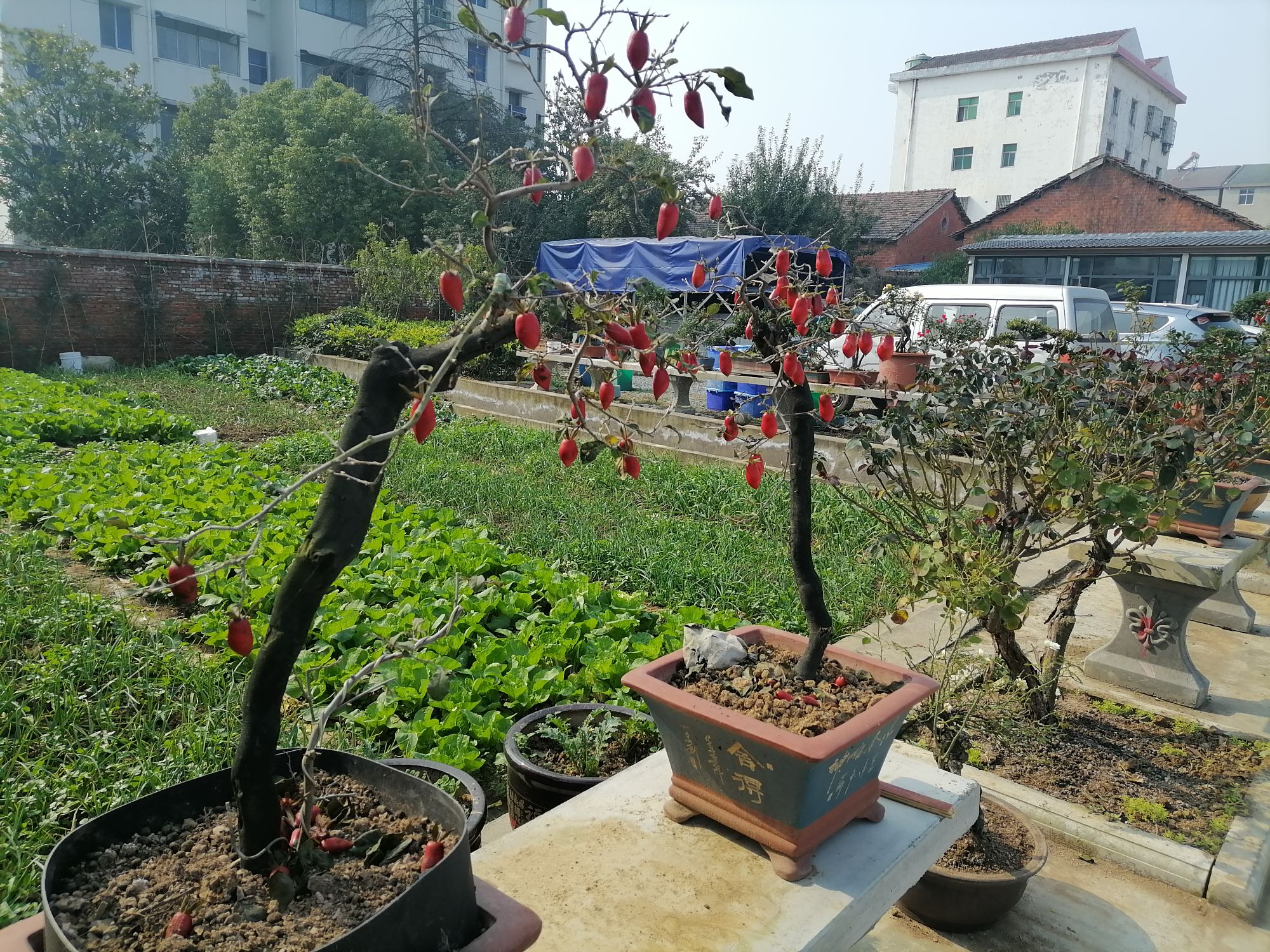 左边一溜石凳过膝,俨然盆景长廊,多托着古拙苍劲的对节白蜡。居中两盆老鸦柿,果实殷红如灯,玲珑可爱;间缀南天竹、中华蚊母,绿意盎然。