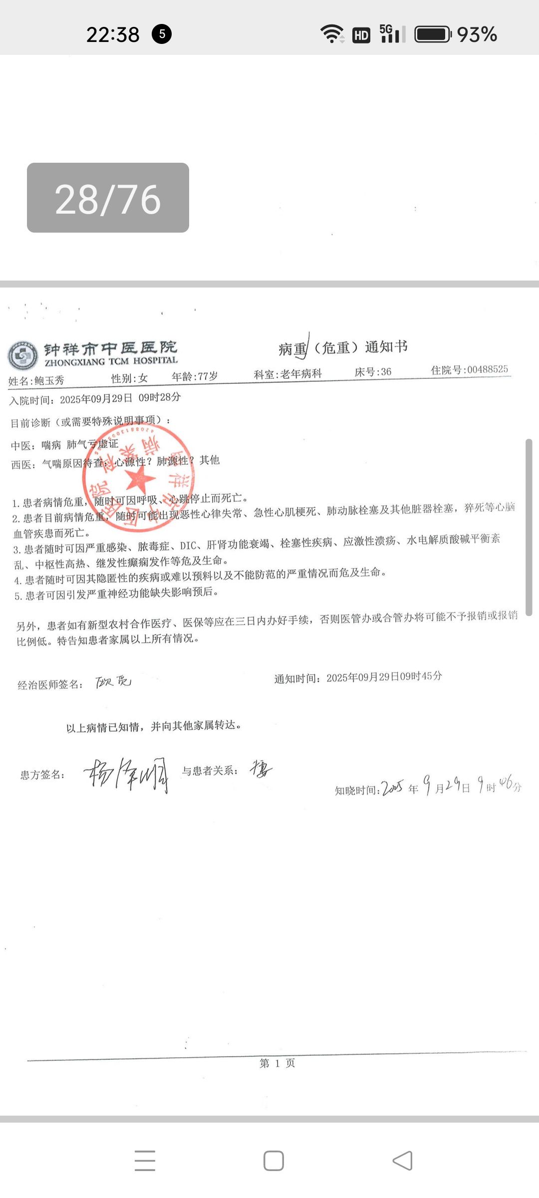 2.病情如此严重,院方却不及时跟家属说明病情的严重性。不及时联系病人子女一定要到场.只叫我父亲在一系列单上签字。我父亲76岁了,他根本不知道签的什么,还以为是普通的住院手续,前一天入院到第二天早上死亡,家属都不知道病情如此严重。
