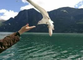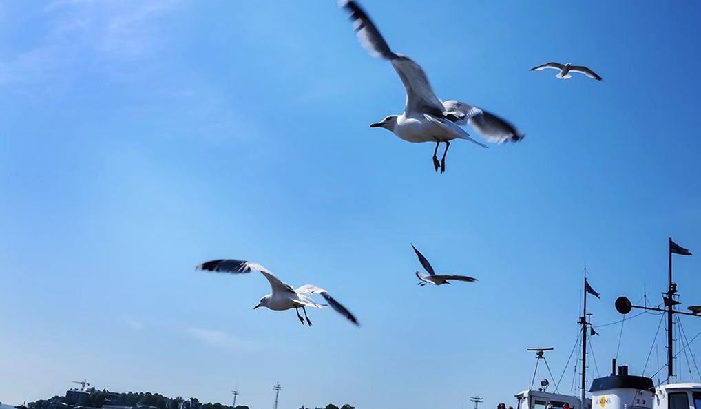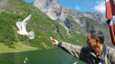 正午时分,阳光透过树叶的缝隙洒在峡湾上,波光粼粼的水面成了海鸥的“游乐场”。游船驶过水面,掀起层层浪花,海鸥们紧随其后,追逐着船尾的泡沫,时而俯冲而下,叼起水中的小鱼,时而展翅滑翔,与游船并驾齐驱。甲板上的游人们忙着投喂面包屑,海鸥们精准地接住食物,有的甚至会轻轻啄一下游人的手心,带着几分亲昵与调皮。一位来自中国的阿姨,一边小心翼翼地递出面包,一边念叨着“慢点吃,别抢”,海鸥们仿佛听懂了一般,有序地轮流进食,画面格外温馨。不远处,一对情侣依偎着栏杆,海鸥落在他们肩头,为他们的合影增添了意外的惊喜,快门按下的瞬间,爱情与自然的美好在此刻交融。