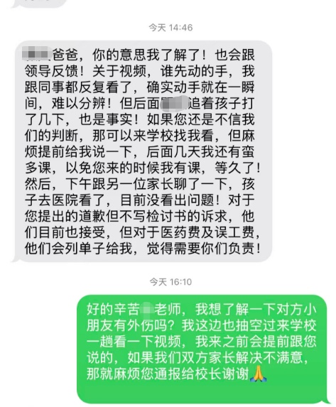我儿子今年读五年级和另外同学发生小冲突,起因是另外一名同学进门冲着我儿子大吼,说我儿子把门关了不让他进,监控调出来不是我儿子关的门,儿子进行还击,然后双方相互打了几下,最后我儿子又冲上去又对着同学身体打了几下,但都不重,对方家长说小孩子说不舒服要到医院检查,检查结果医生说没任何问题,现在对方要求我儿子写检讨书道歉以及赔付医药费和误工费,老师觉得合理,大家说合理吗?帮我想想办法如何出招化解谢谢大家🙏