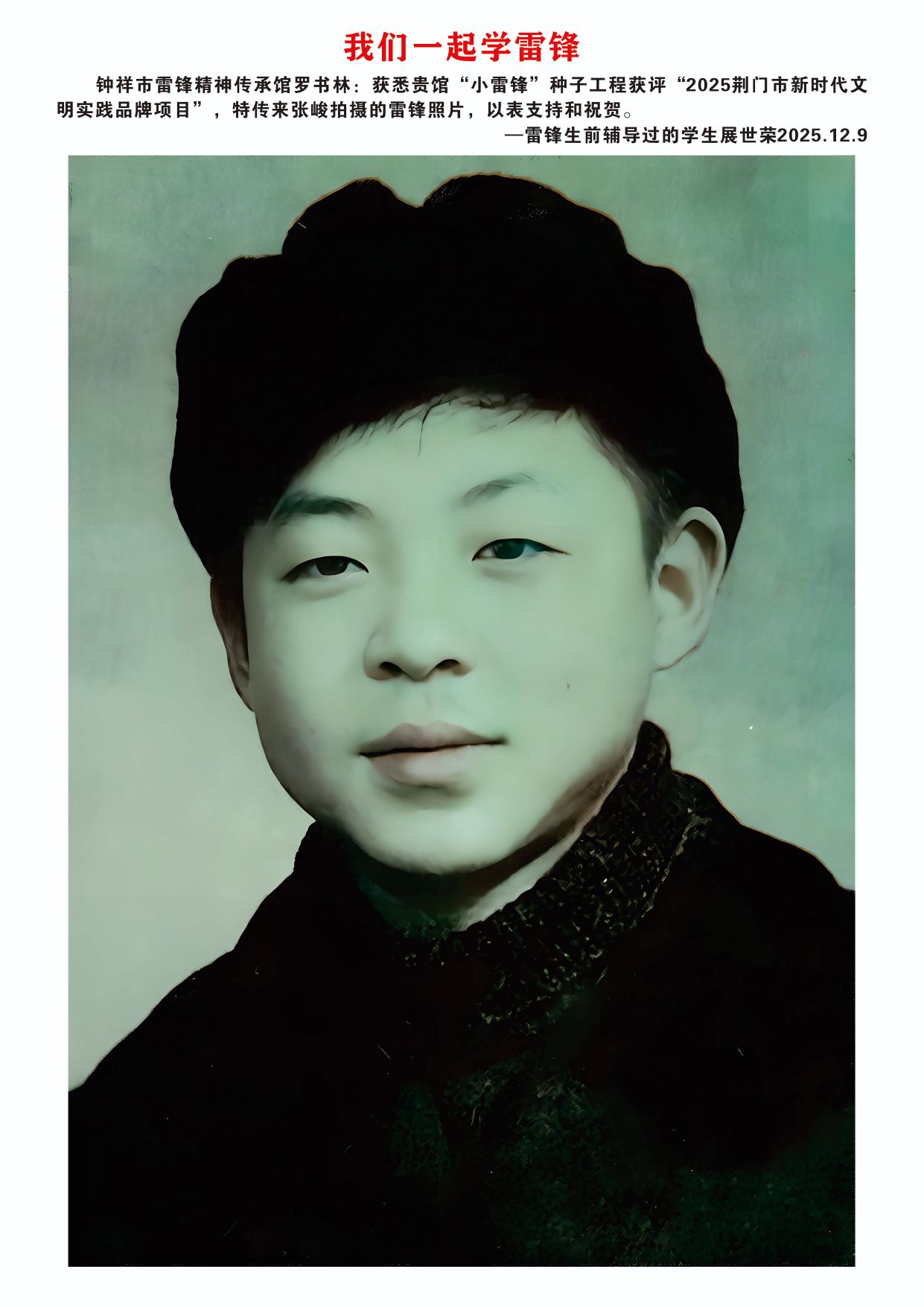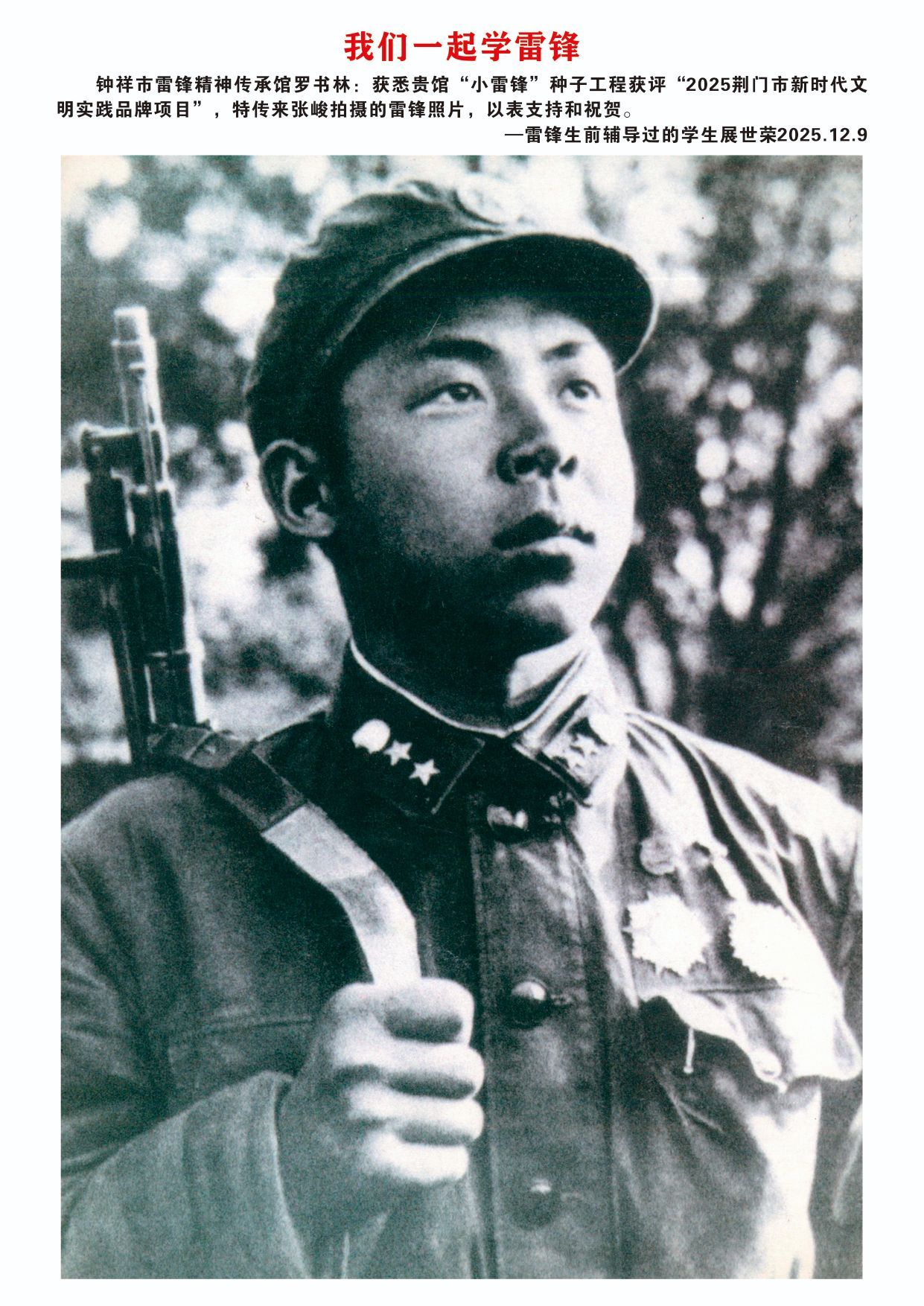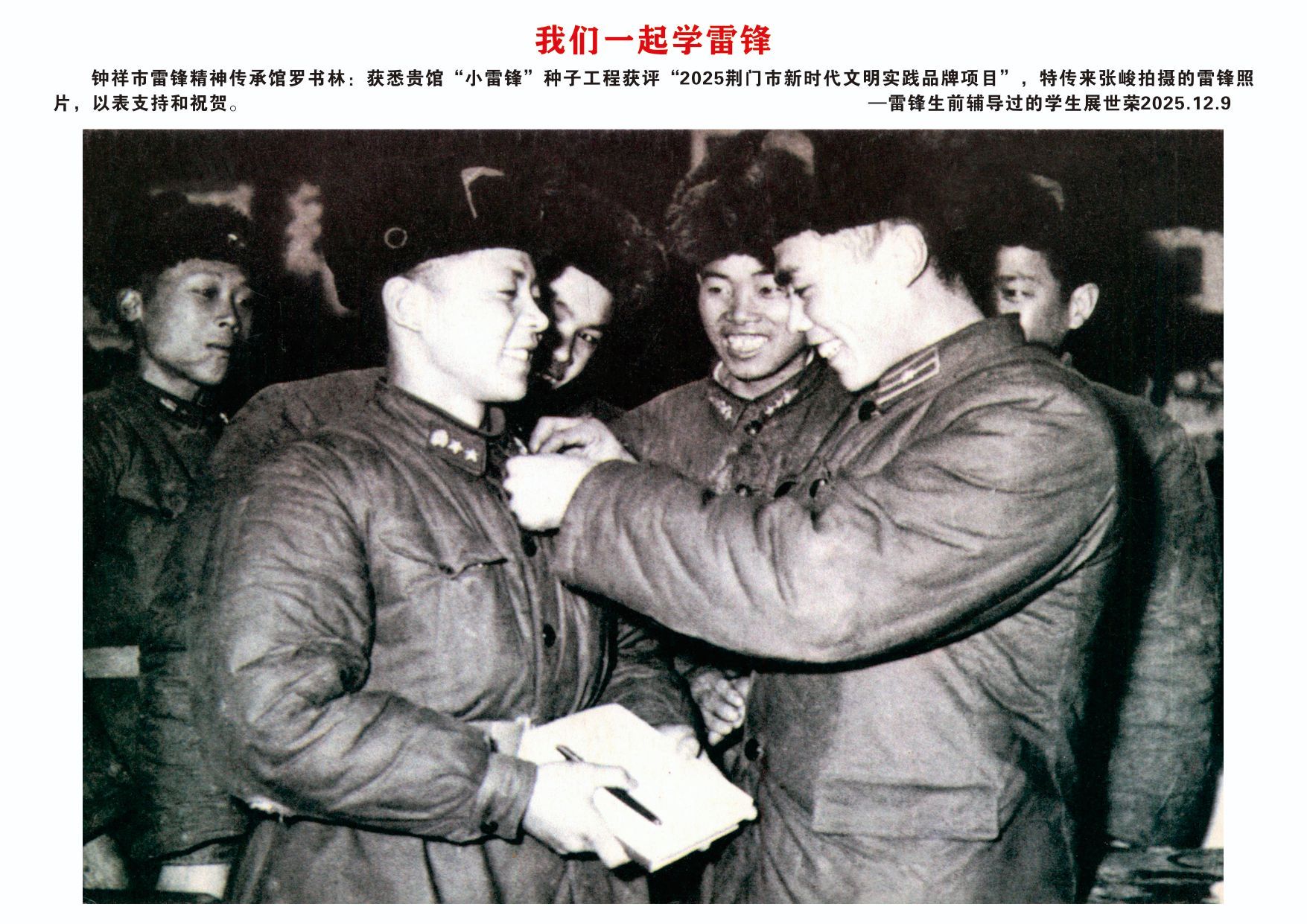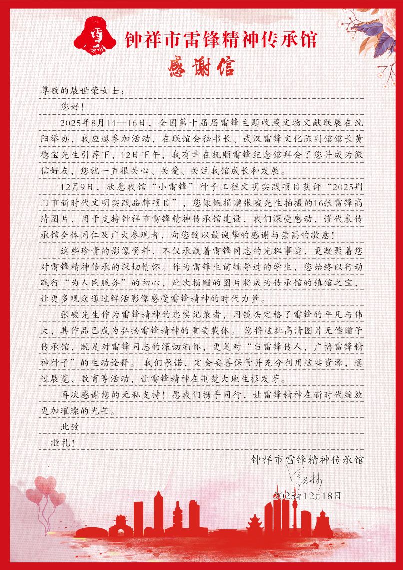 12月9日,欣悉我馆“小雷锋”种子工程文明实践项目获评“2025荆门市新时代文明实践品牌项目”,您慷慨捐赠张峻先生拍摄的16张雷锋高清图片,用于支持钟祥市雷锋精神传承馆建设,我们深受感动,谨代表传承馆全体同仁及广大参观者,向您致以最诚挚的感谢与崇高的敬意!