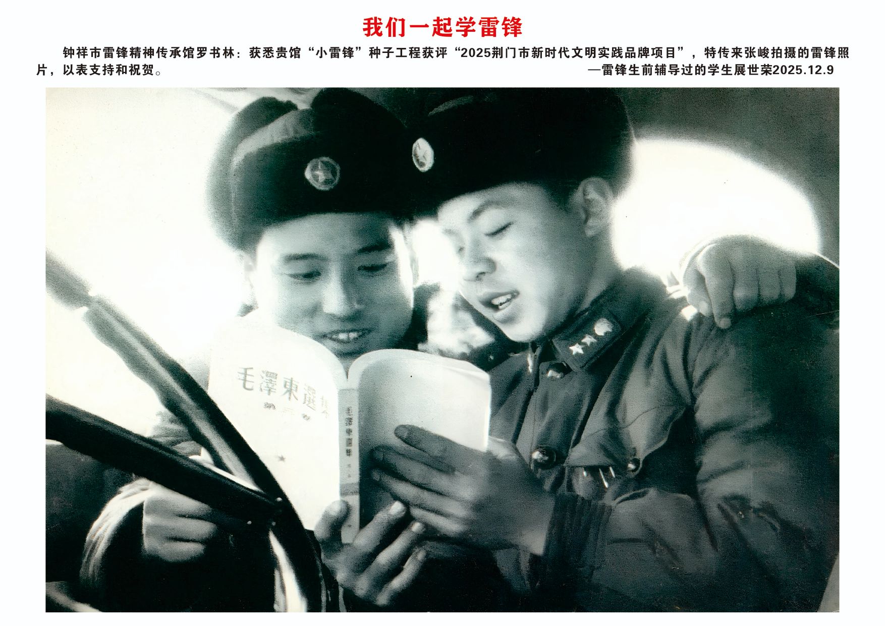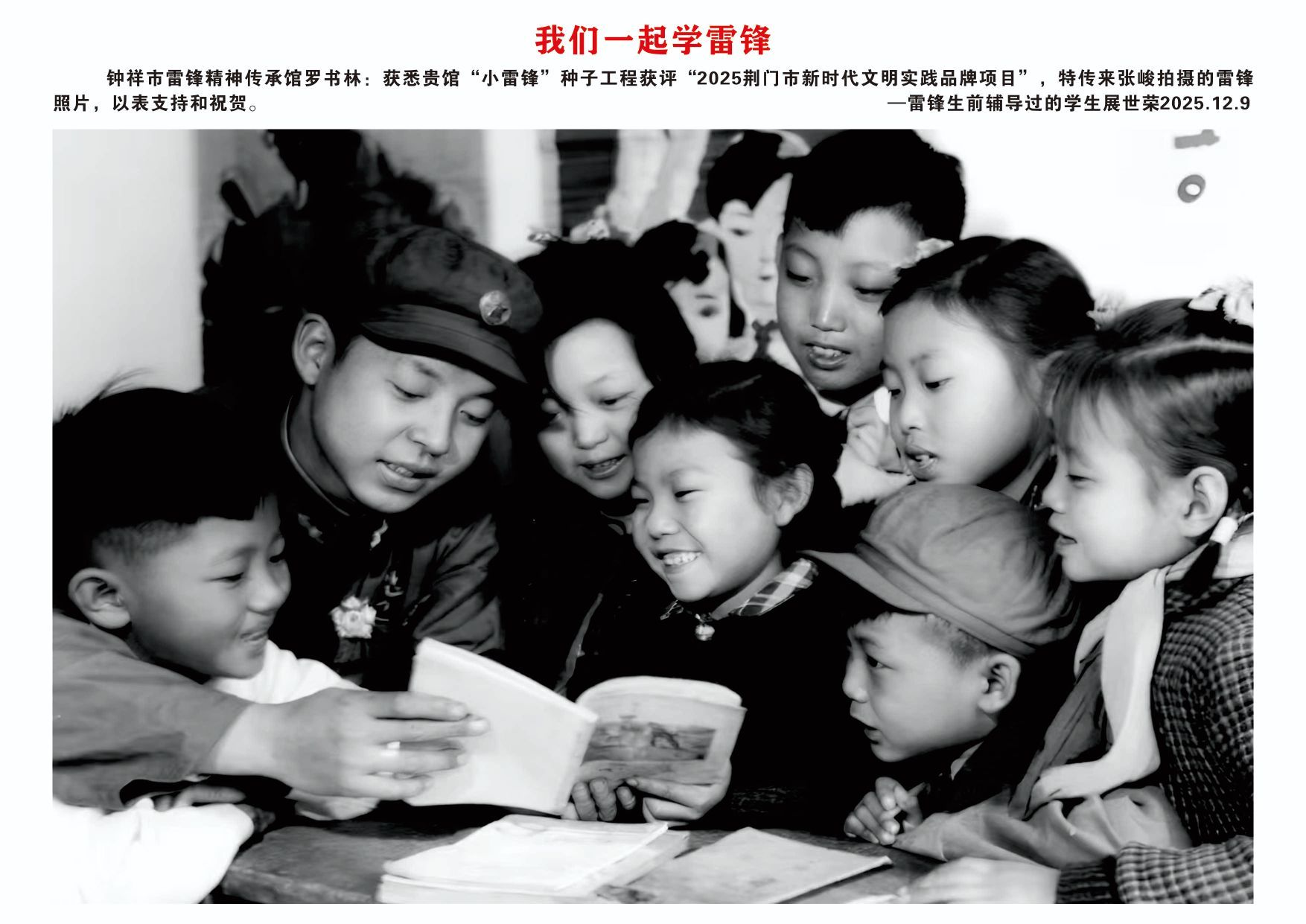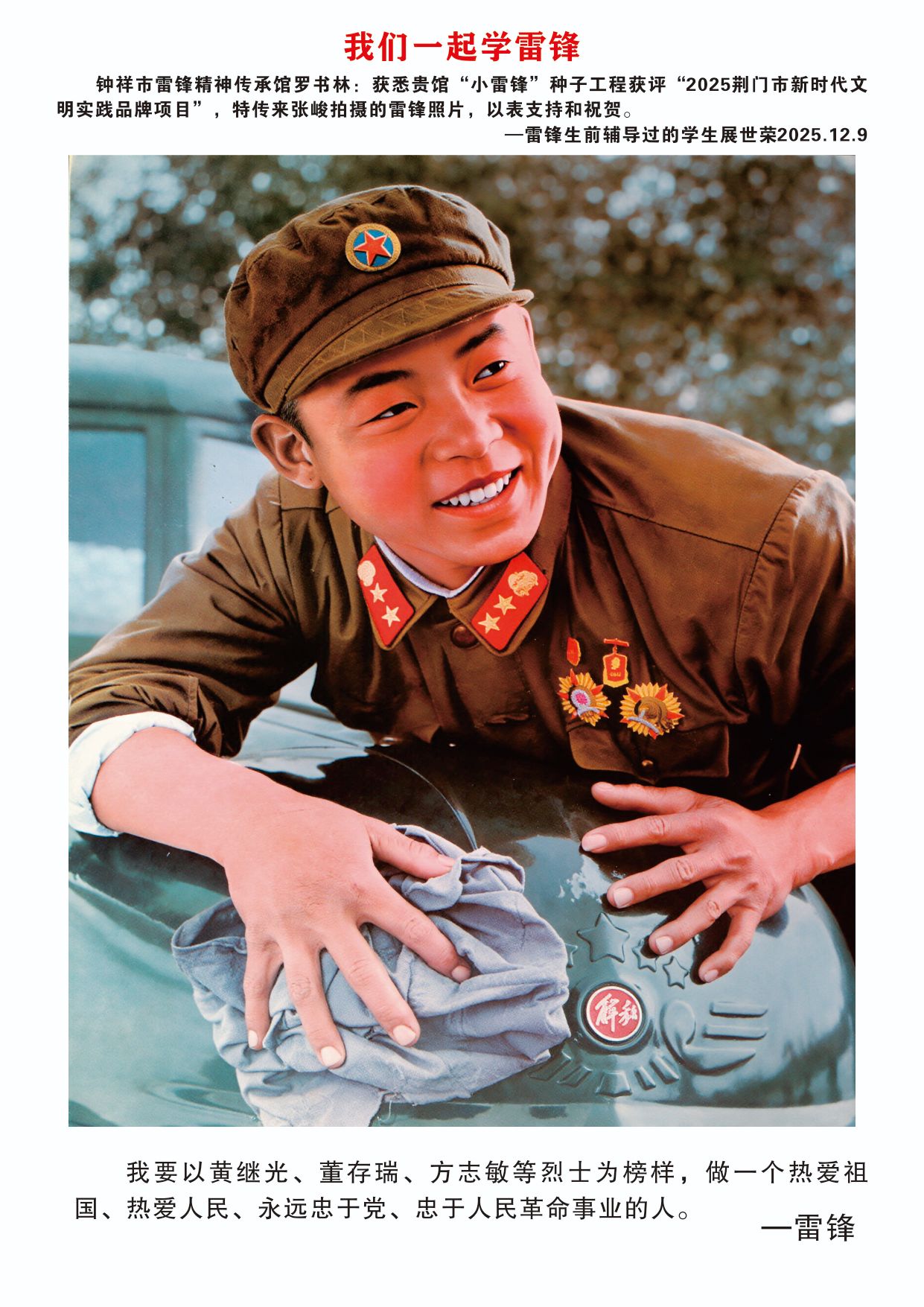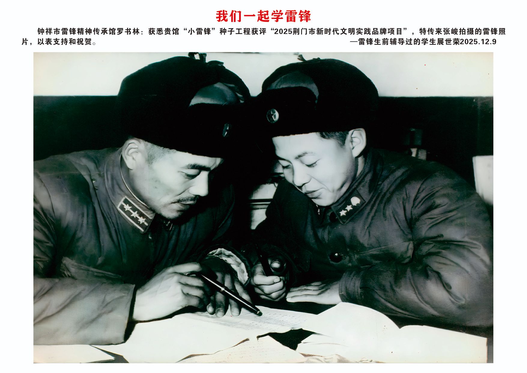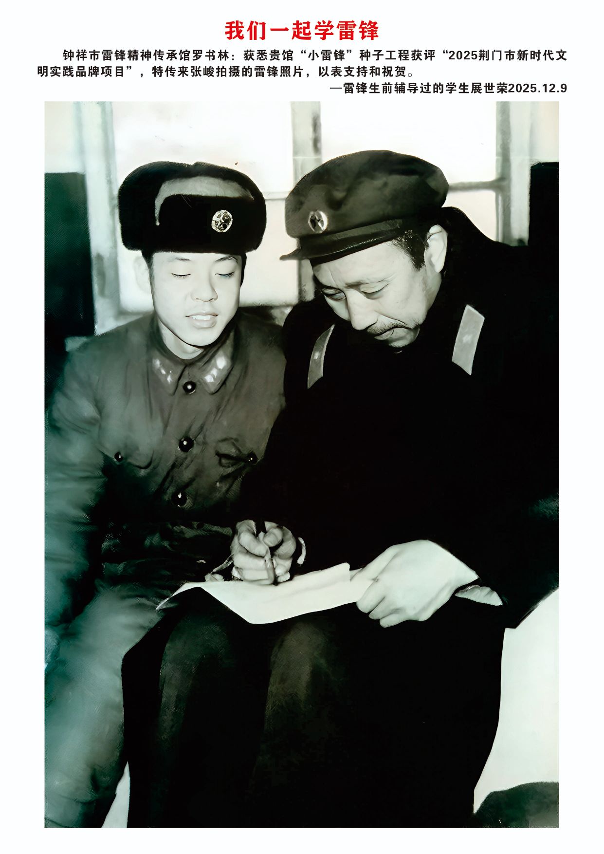 12月9日,欣悉我馆“小雷锋”种子工程文明实践项目获评“2025荆门市新时代文明实践品牌项目”,您慷慨捐赠张峻先生拍摄的16张雷锋高清图片,用于支持钟祥市雷锋精神传承馆建设,我们深受感动,谨代表传承馆全体同仁及广大参观者,向您致以最诚挚的感谢与崇高的敬意!