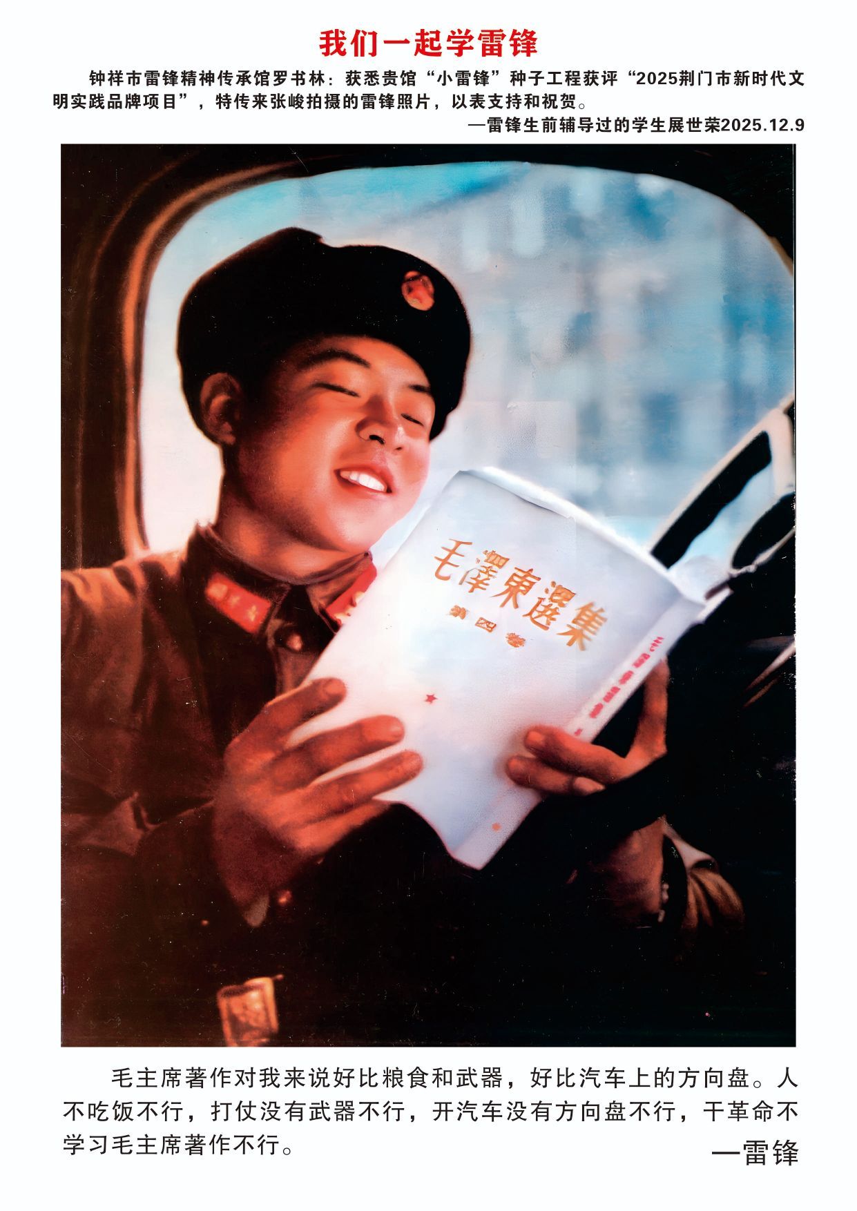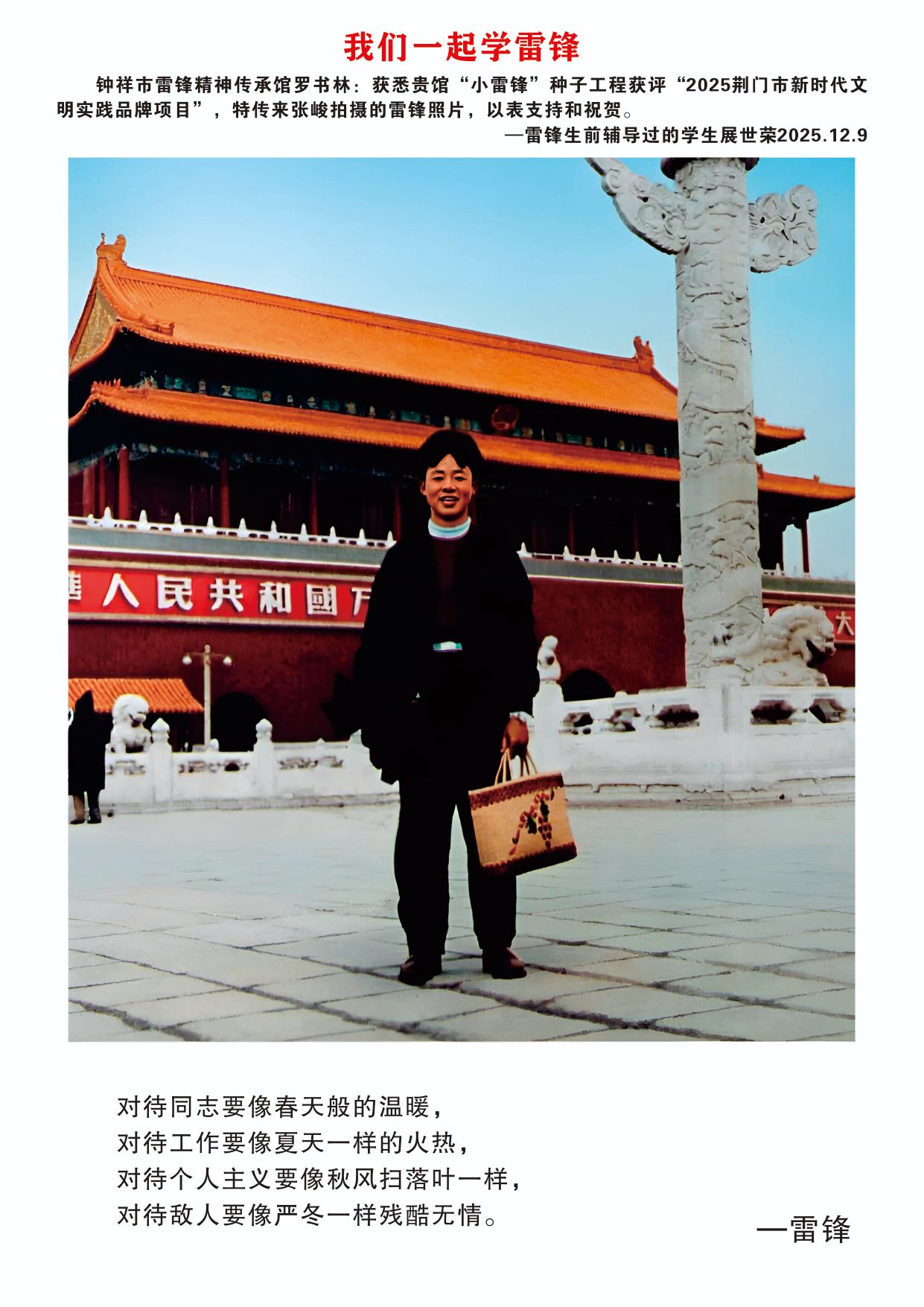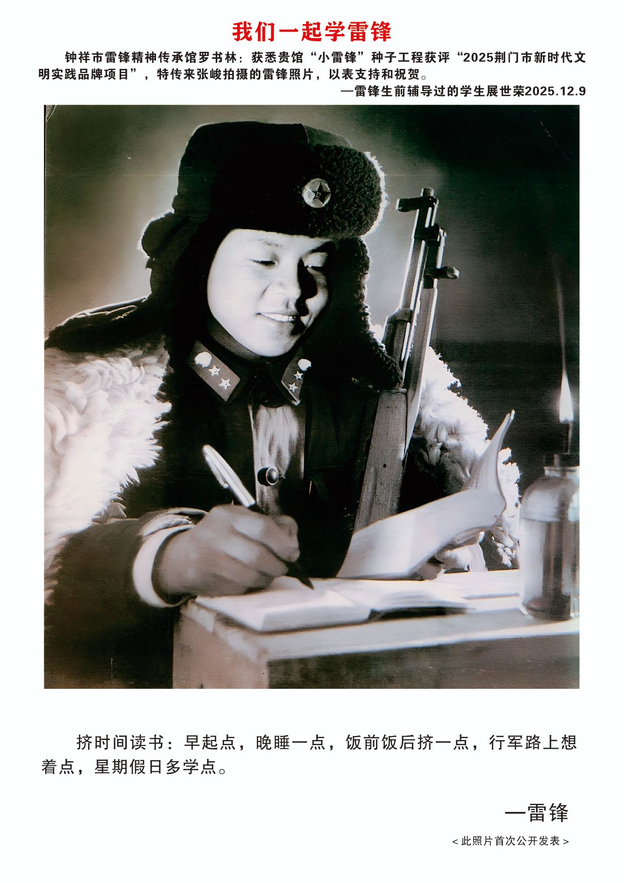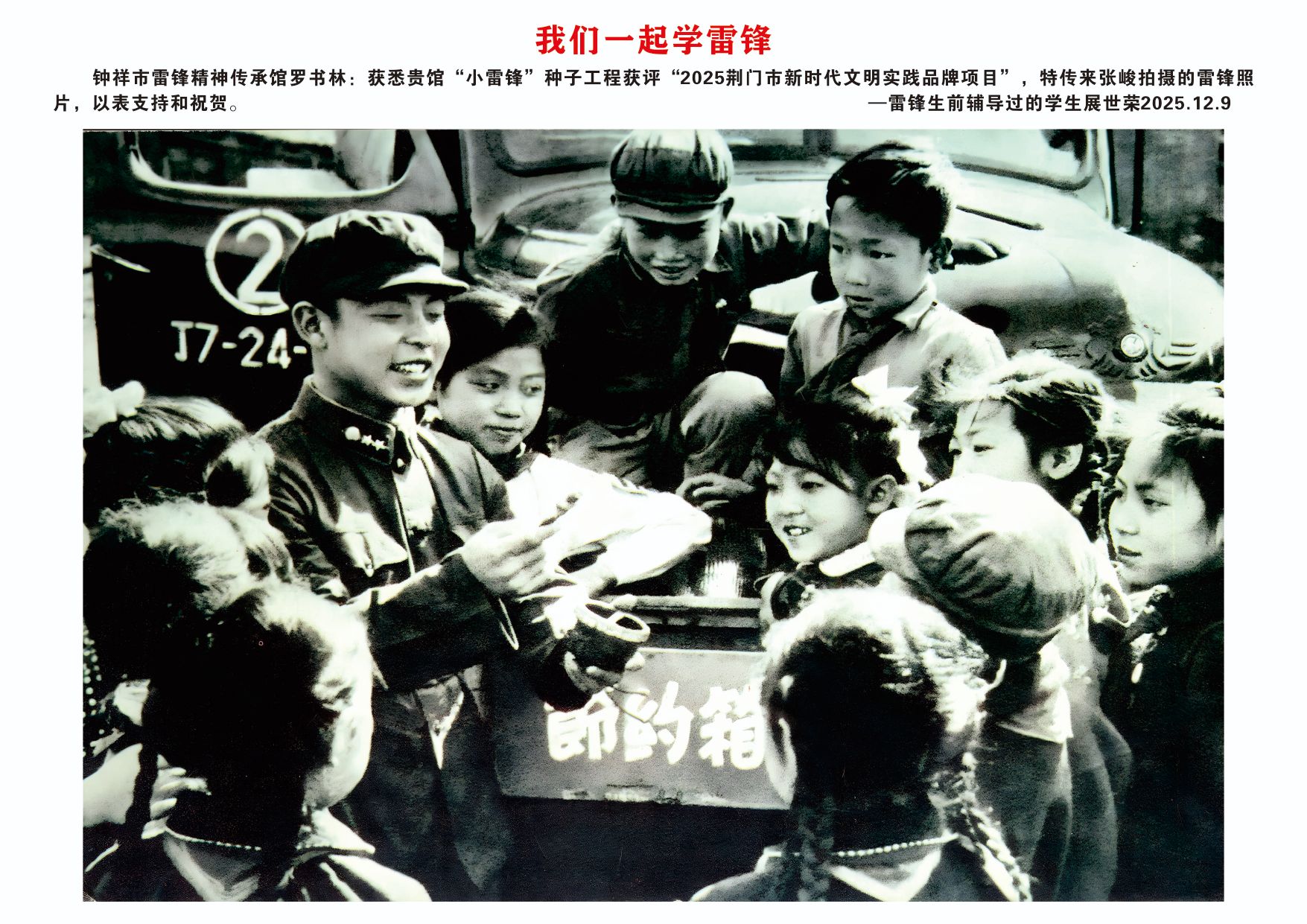 12月9日,欣悉我馆“小雷锋”种子工程文明实践项目获评“2025荆门市新时代文明实践品牌项目”,您慷慨捐赠张峻先生拍摄的16张雷锋高清图片,用于支持钟祥市雷锋精神传承馆建设,我们深受感动,谨代表传承馆全体同仁及广大参观者,向您致以最诚挚的感谢与崇高的敬意!