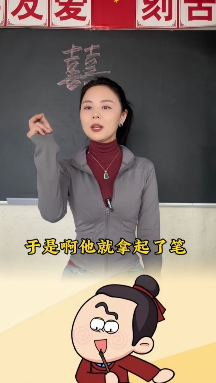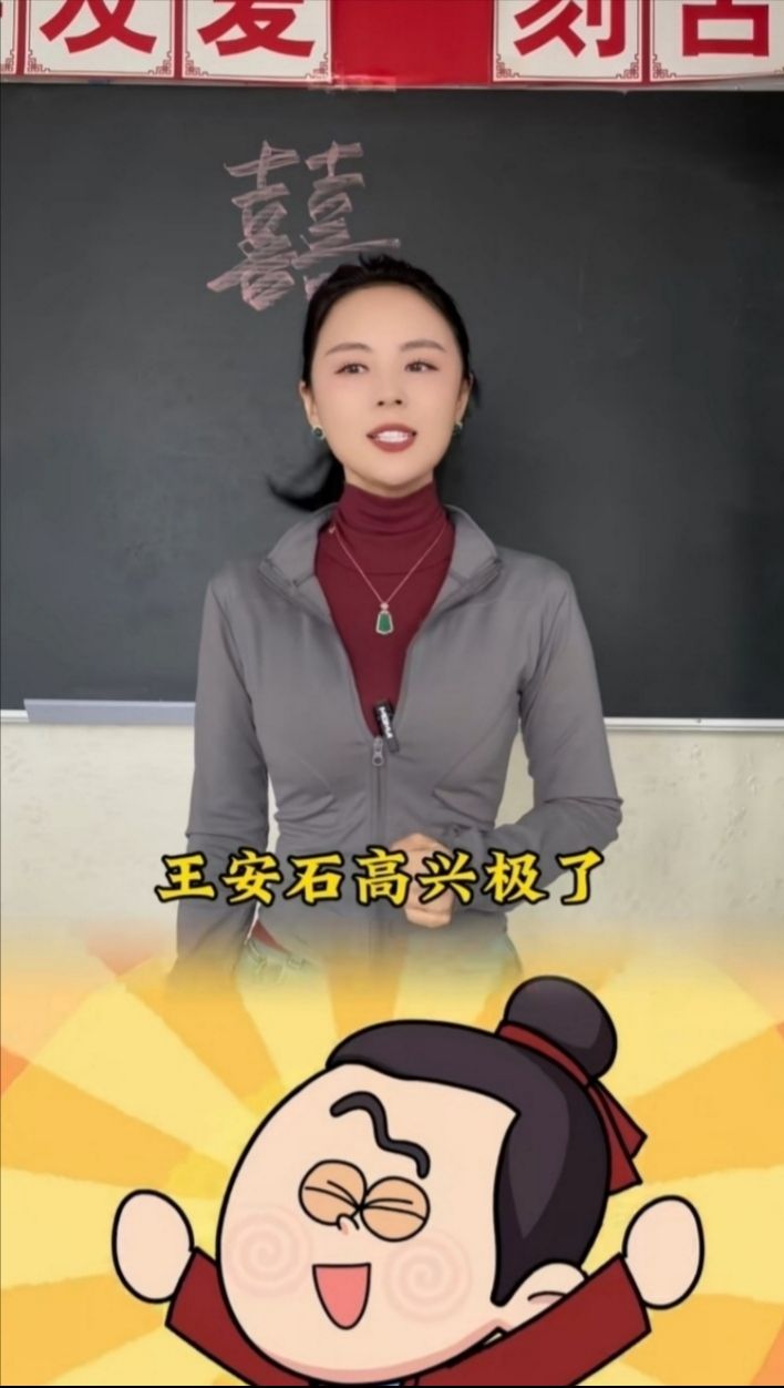 王安石在去赶考的路上,遇到一员外家以对联招亲,员外家出上联是:“走马灯灯马走灯熄马停步”,因为要赶考,王安石没有停下来去思考下联。到了考场参加考试,王安石很快答完题交了卷,监考官为了测试他是否有真才实学,便又给他另外加了一道题,出题是一下联:“飞虎旗旗飞虎旗卷虎藏身”,王安石心里微微一惊,有感应似的就想到那个招亲的上联与此下联正好一对,于是便填上招亲联交了答题,考试完又往回赶,招亲还在进行,他拨开人群跳上擂台,便把考场上的出题下联,当作招亲的下联说了出来,小姐一听高兴的不得了,员外家当即招王安石为婿与小姐成亲。婚礼前要贴大红喜字对联等,正在准备时,忽然快马来报,王安石高中了状元,得此消息,王安石高极了,洞房花烛夜,金榜题名时,一天双喜临门,他便挥毫写下了两个连体“囍”字贴在门上,从此,凡结婚贴喜字都用上了双喜字,寓意好事成双,双喜临门。