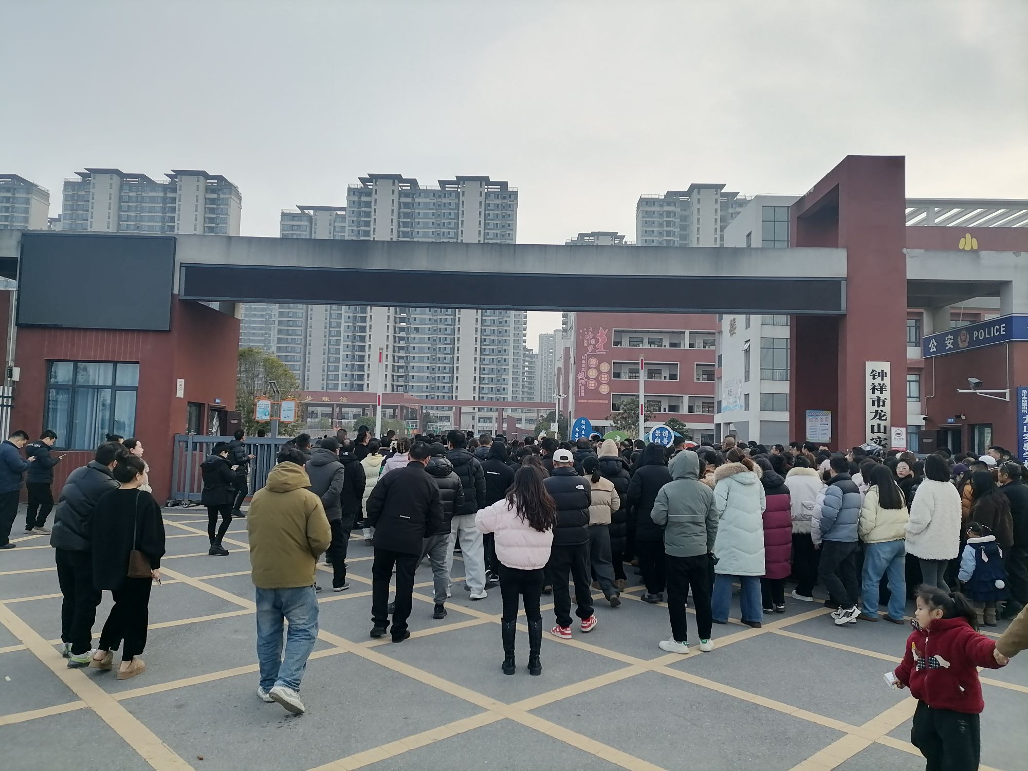 上图为放寒假来校接孩子的家长们。