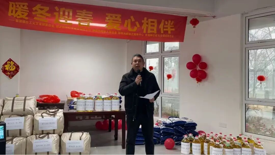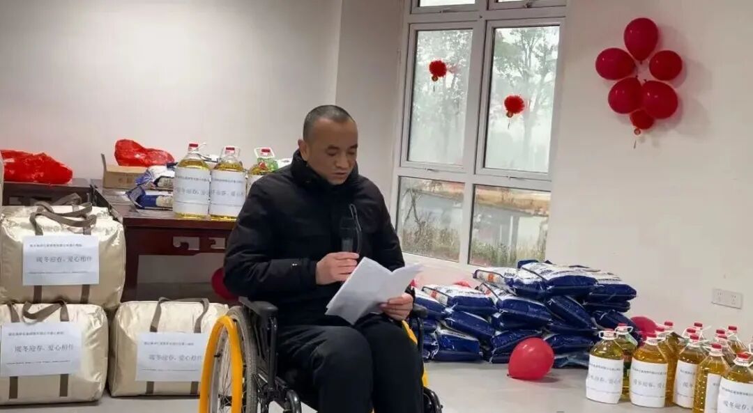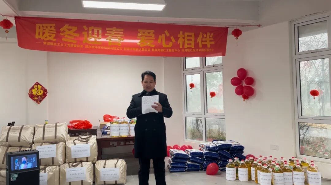 随后,邀请了湖北福泽亿家商贸有限公司董事长时丰敏与大柴湖经济开发区社会事务办副主任孙峰依次讲话,向残疾朋友们致以新春的问候,愿大家度过一个祥和温暖的春节;残疾朋友王明军也分享了自己的感受,表达了诚挚的谢意和对残友的鼓励。在温馨的氛围中,孙主任、黄主任、时丰敏董事长、总经理郑伟、洪扬一同为在场的残疾朋友们送上米、油等新春物资,把实实在在的关怀送到大家手中。