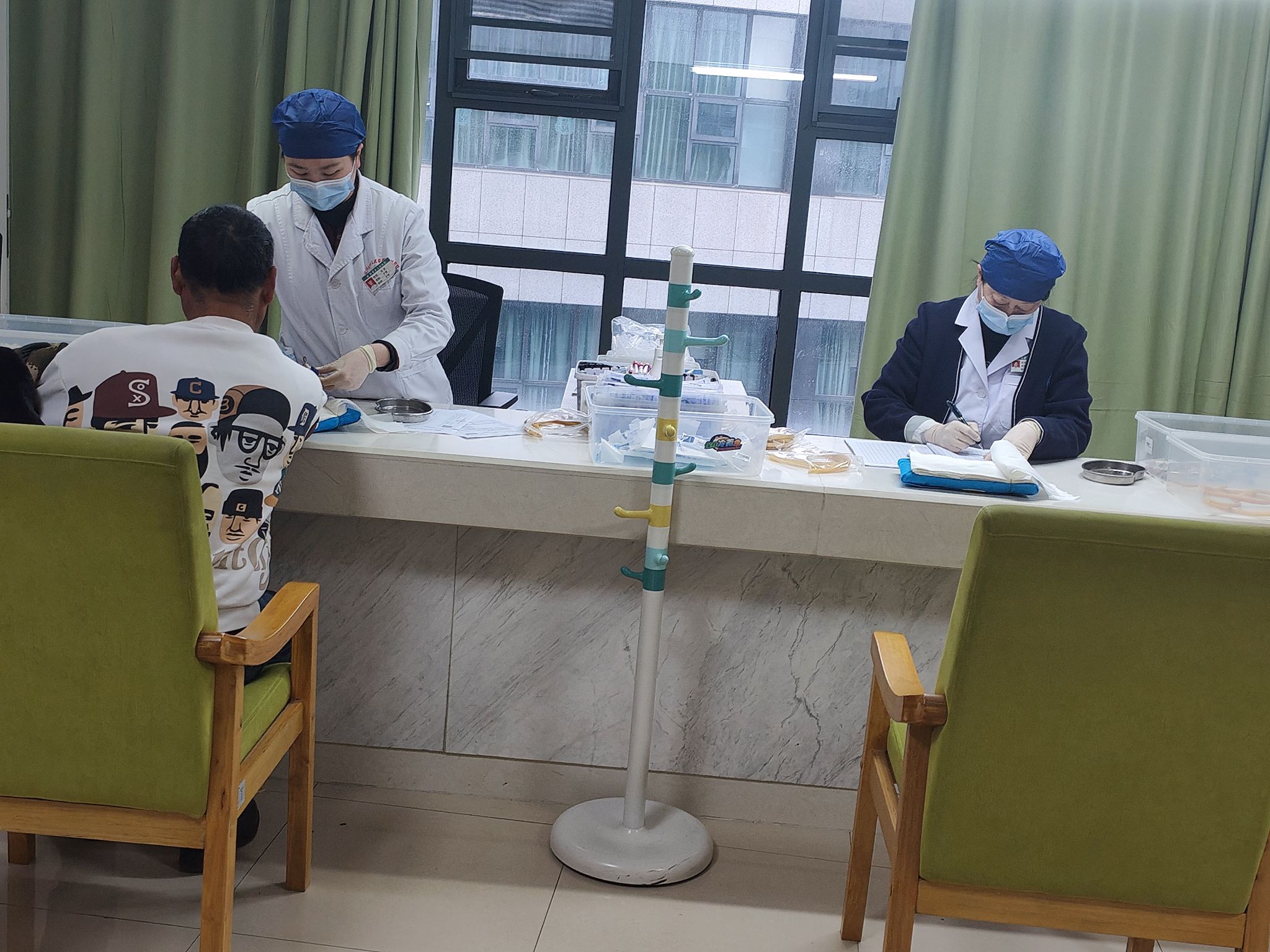 今天早上约7点20分,我拟乘公共汽车或人民医院专线车去体检,巧遇体检中心李锐主任(我们一个小区邻居)一并到公汽站,与他一起乘笫4趟专线车,人不太多,约20分钟到达4楼体检中心,正好中心的人员上班,冯悠女士按预约项目及我增加的项目打印体检表,她又帮我抽取化验的血。随后在4楼华女士量血压(因空腹不能吃降压约,血压高,又量了一次)称体重,测身高,做心电图;然后至3楼做几项超声项目。
