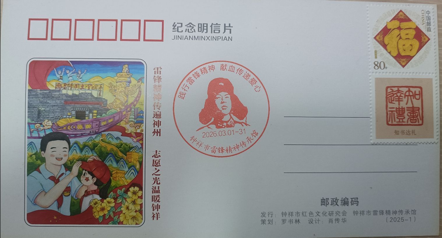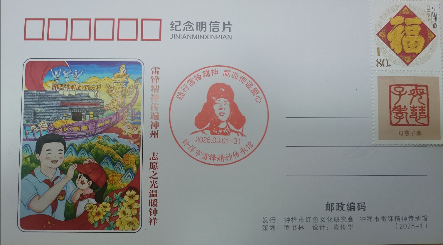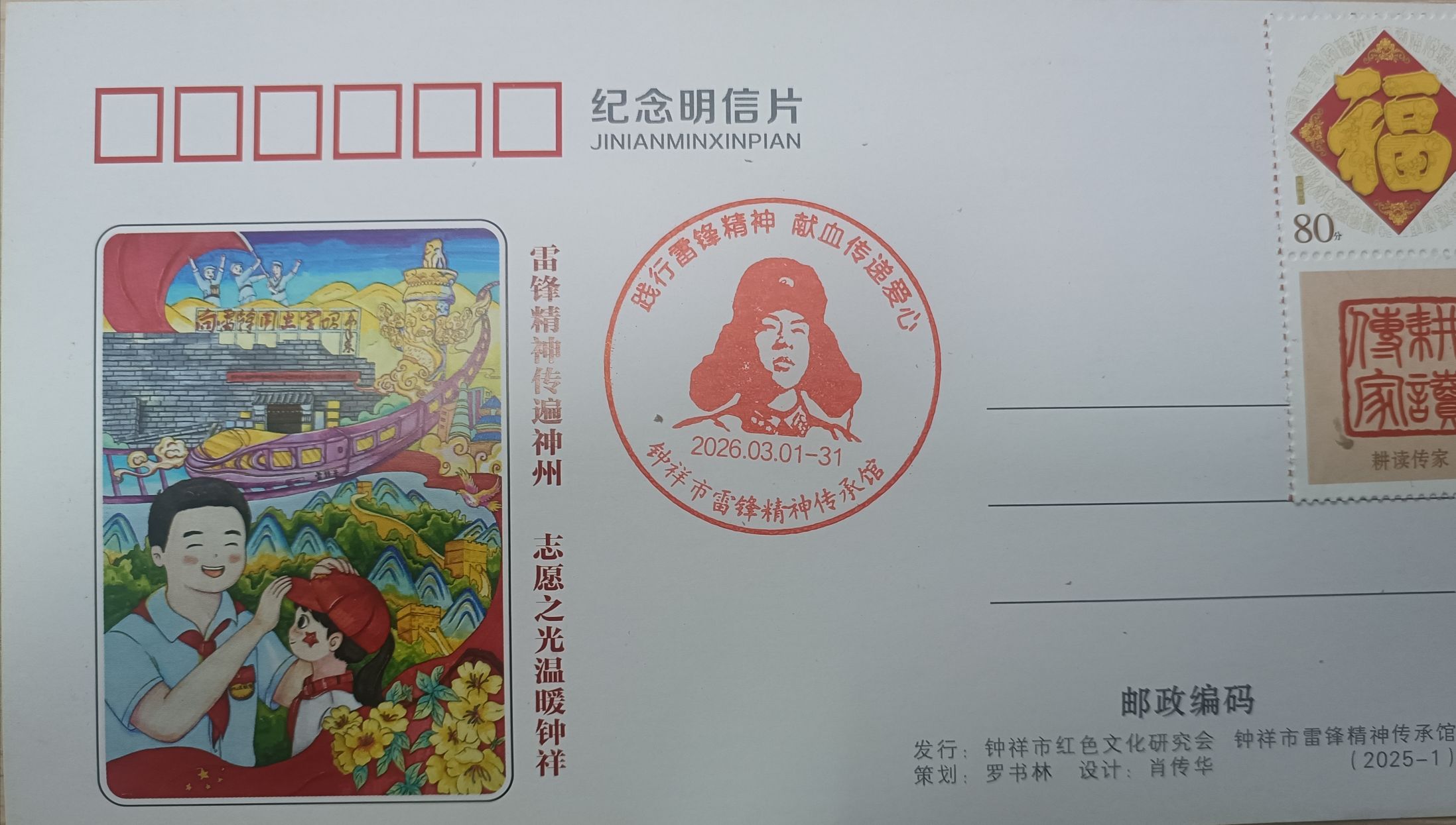 钟祥市雷锋精神传承馆刻制纪念章,为前100名无偿献血者赠送纪念明信片一枚