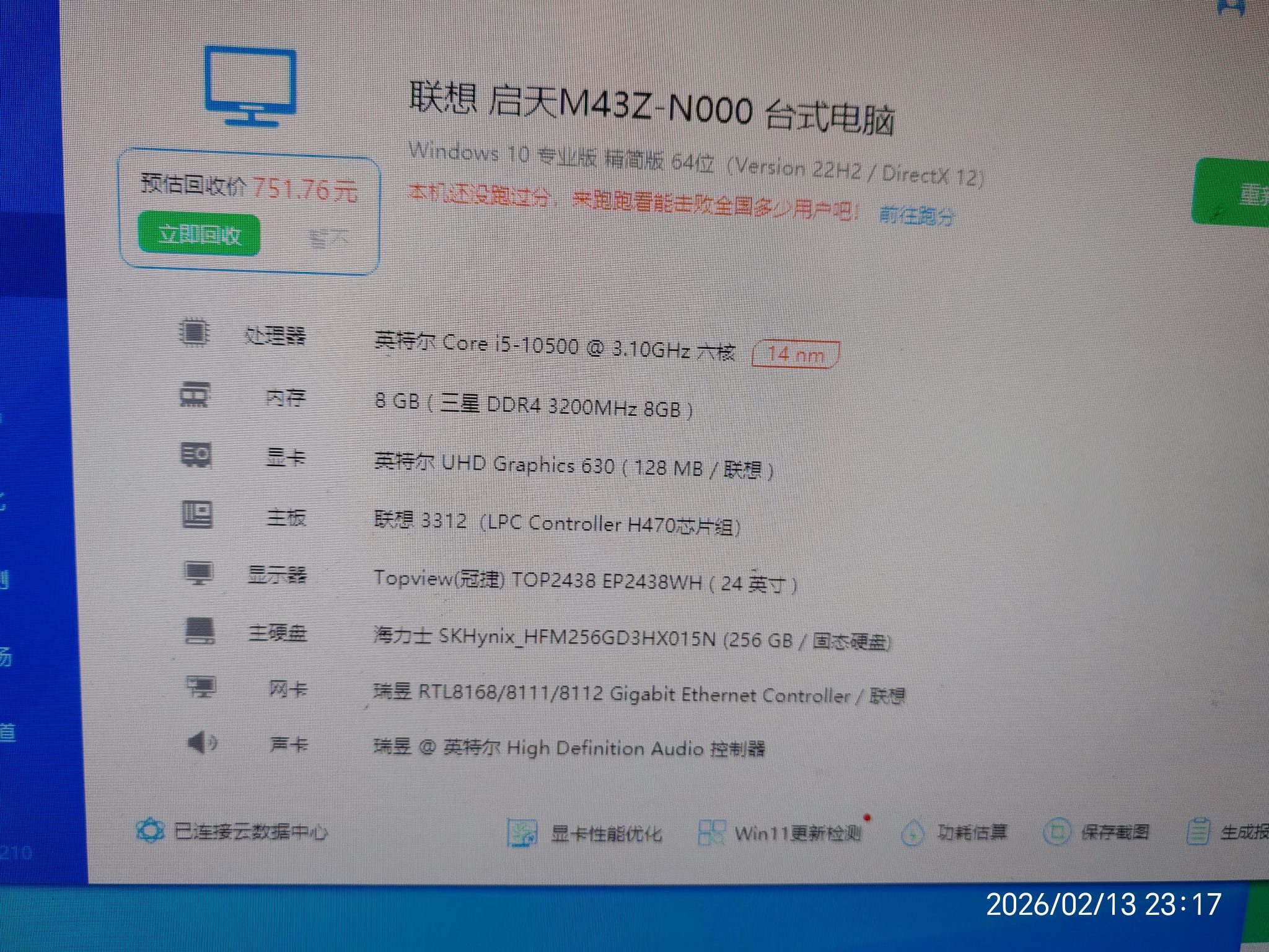 主机一套,联想 启天M43Z N000 准系统 全原装,CPU I5 10500 8G内存 海力士 256GB 1450块;可搭配一个24寸显示器(180元),(需要独立显卡可搭七彩虹GT750ti或GT650显卡一起出99--199)