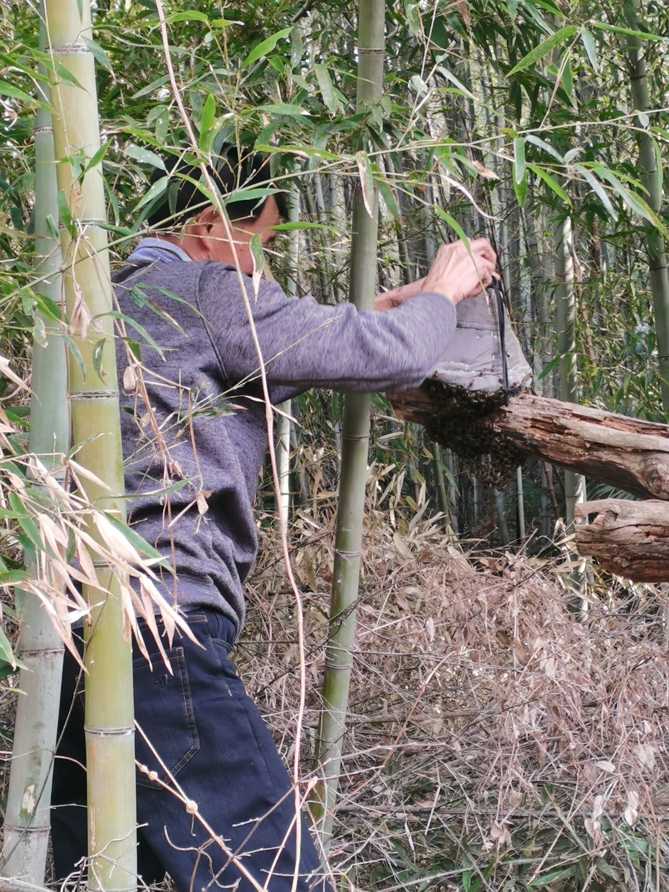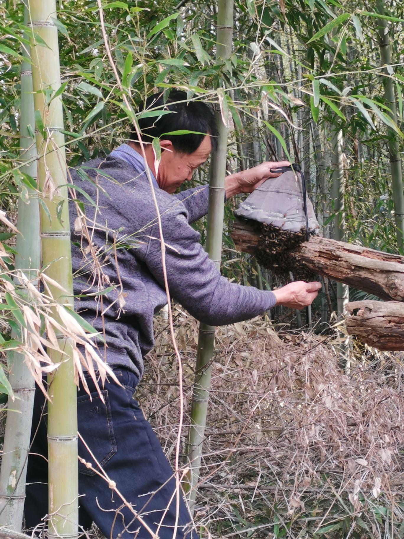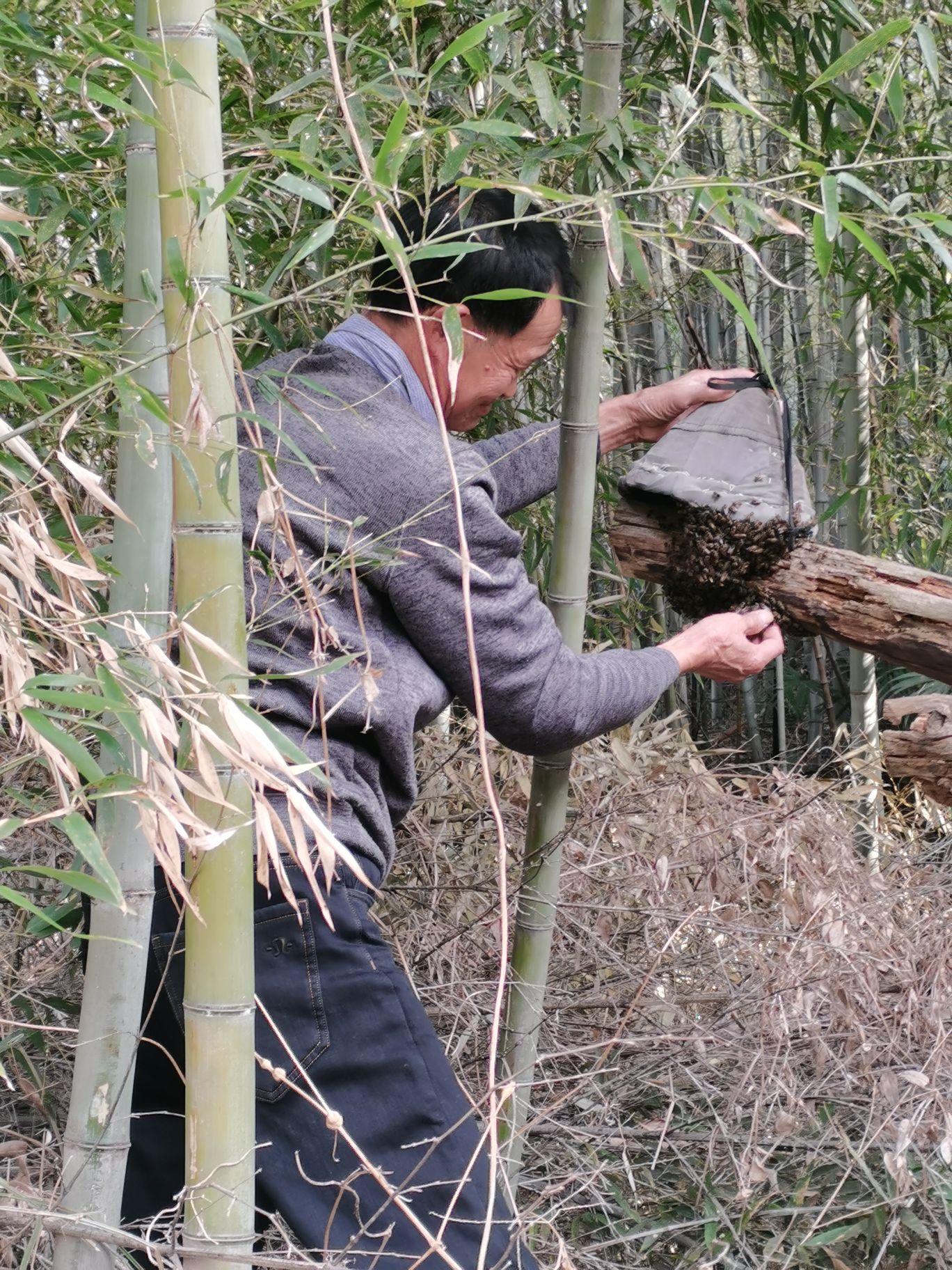 家门口,看爸爸收从别处跑来的土蜂子,原来是用这个像帽子一样的工具慢慢的收进来的,再放到蜂箱里面,长见识了