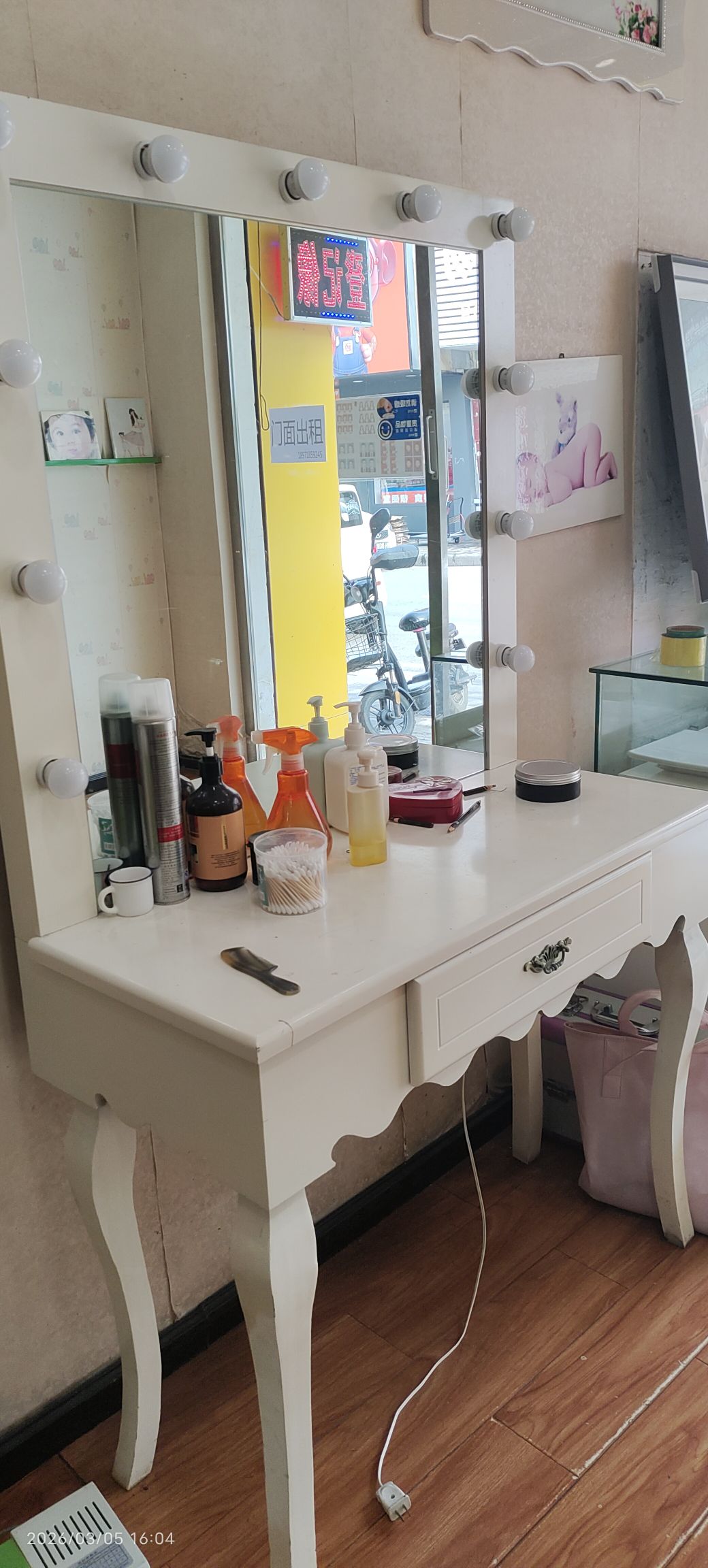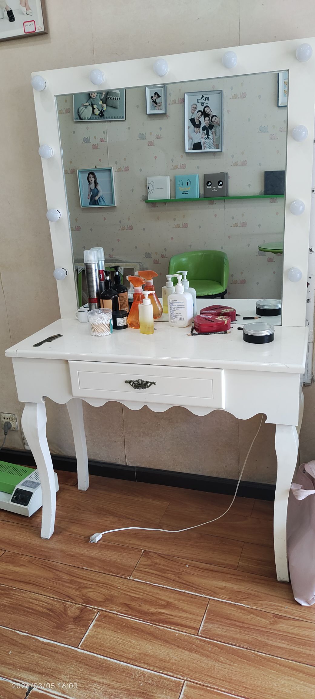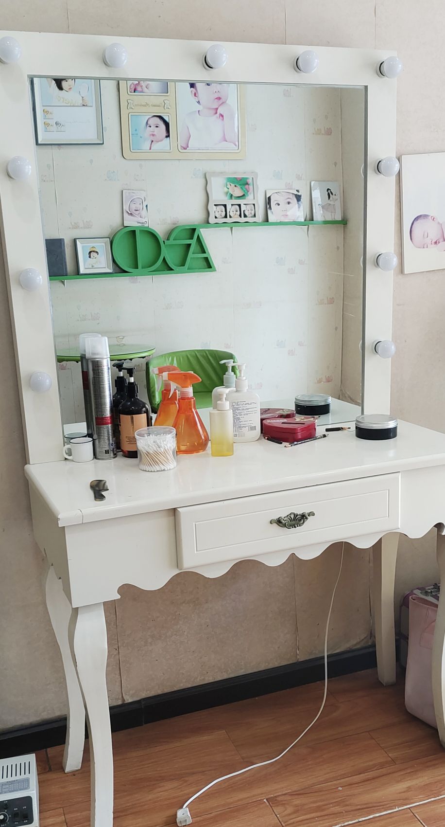 白色化妆桌,带灯镜,插电就能用,工作室家用都合适,化妆拍照都很方便。