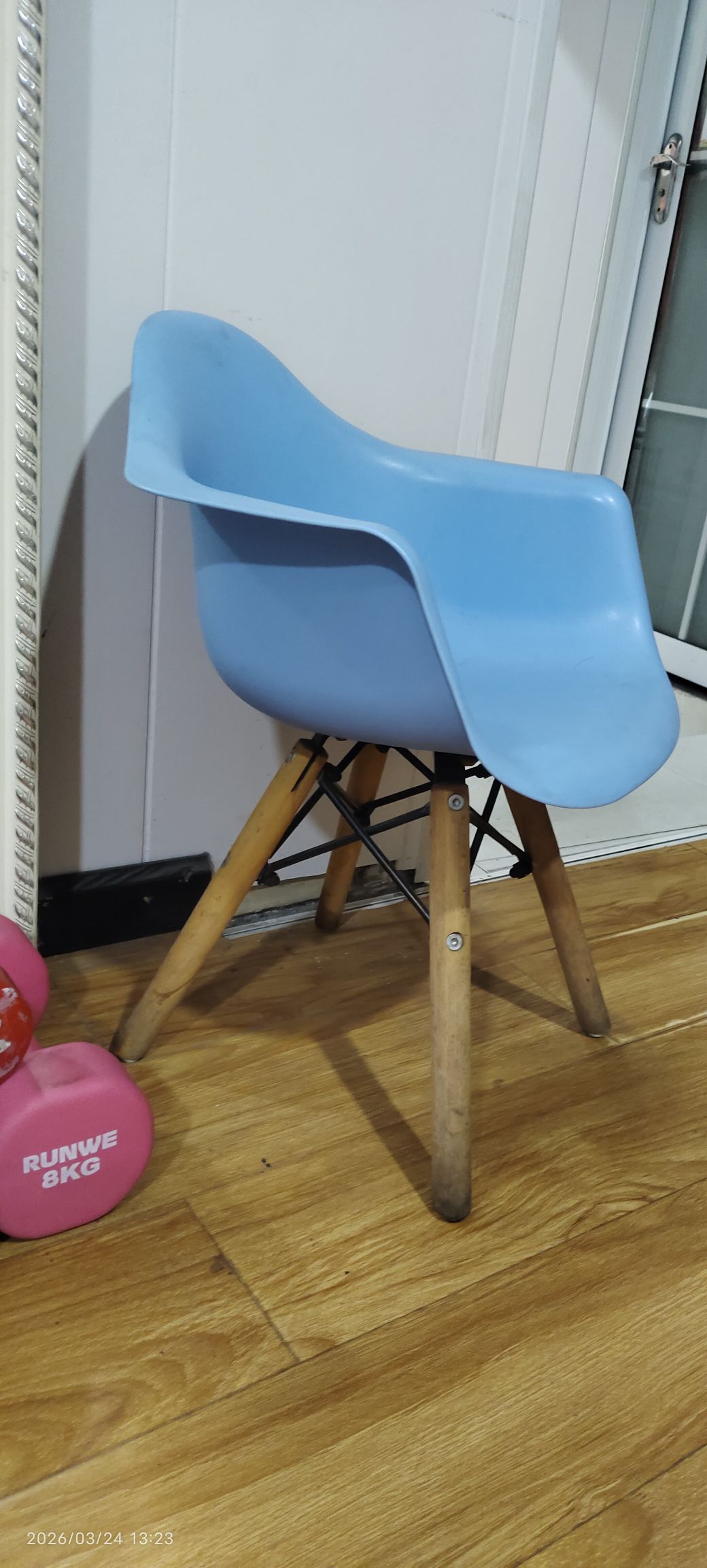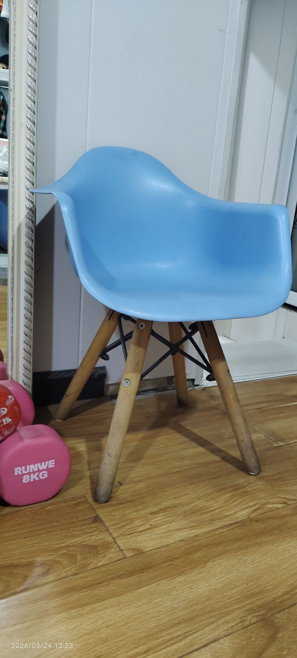 蓝色伊姆斯风格椅子,塑料椅身+原木色腿。50元,18971859245