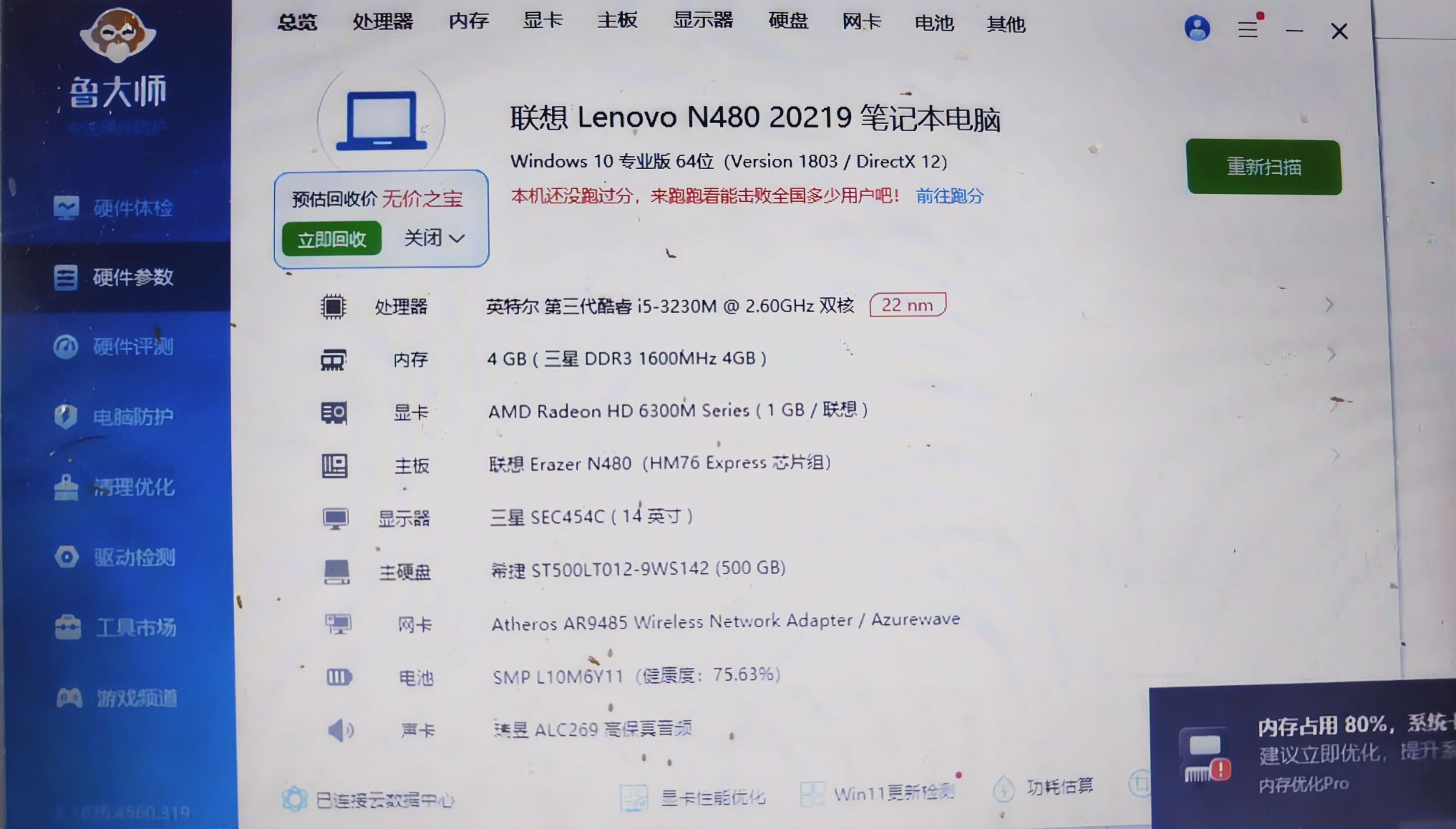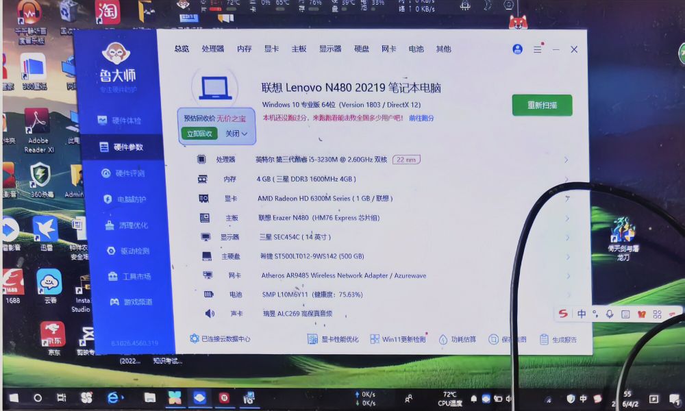 联想N480笔记本,i5-3230M处理器,4G内存,500G硬盘,集成显卡,办公学习用的,成色还可以,有点使用痕迹,键盘屏幕都正常,开机没问题,电池健康度75%。具体参数看图。D键的壳掉了,但不影响使用