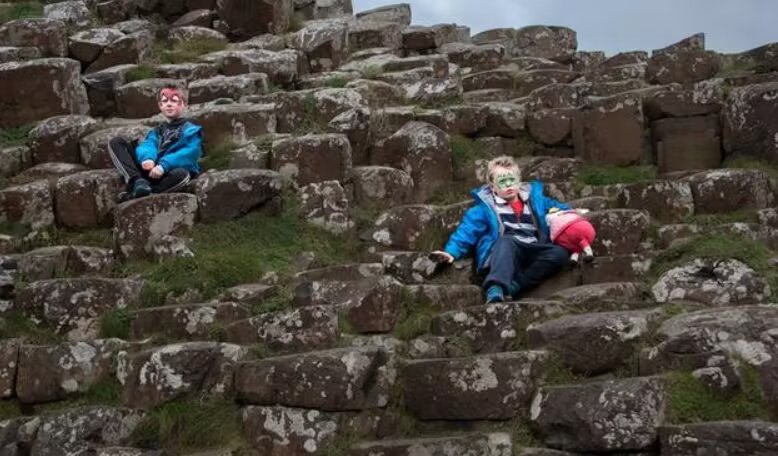 这些玄武岩石柱高矮不一,最高的达12米,紧密排列着,棱角分明,仿佛是巨人精心搭建的石阶。当地流传着这样的传说:远古时期,巨人芬·麦库尔为了与苏格兰的巨人一决高下,开凿岩石,铺就了这条横跨大西洋的石路。正对着石柱群出神时,一位白发苍苍的当地老人主动走来,用带着爱尔兰口音的英语给我补充传说细节:“芬·麦库尔后来用浓雾遮住石路,让苏格兰巨人不敢过来,这石堤就成了他勇气的见证。”老人说着还指了指不远处一块形似脚印的巨石,“你看,那就是巨人留下的足迹呢!”