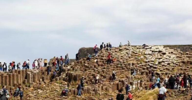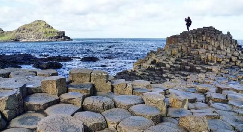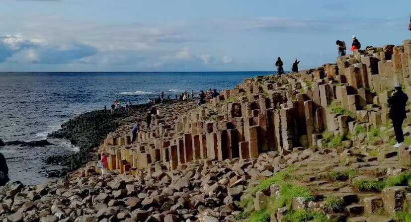 我沿着石堤小心翼翼地前行,指尖触摸着岩石粗糙的表面,上面布满了岁月的痕迹。有些石柱已经断裂,横卧在海滩上,被海浪冲刷得光滑;有些则依然挺立,共同构成了这壮观的奇景。中途想拍一张“与巨人堤同框”的全景照,可风太大总把头发吹得凌乱,一旁一对年轻的爱尔兰情侣见状,主动过来帮忙,男生稳稳举着我的相机,女生则笑着帮我按住乱飞的发丝,还教我找准光线角度,那张照片后来成了我这次旅行最爱的合影。