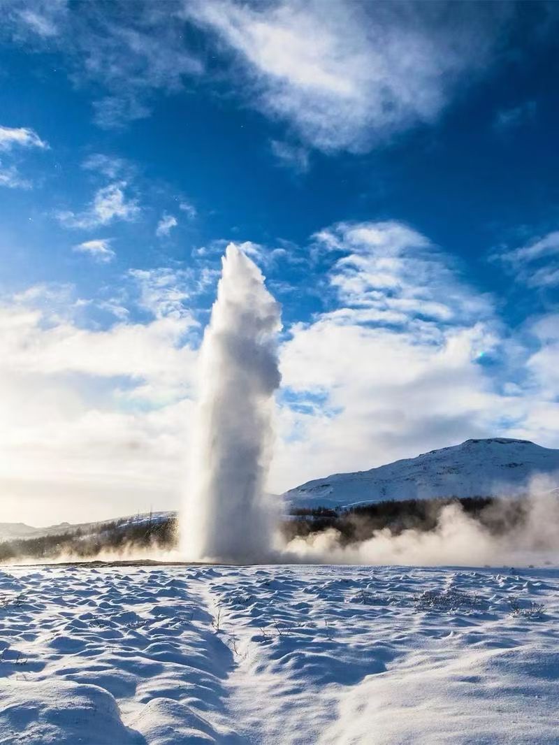紧接着前往盖歇尔地热区,空气中弥漫着淡淡的硫磺味,地面上热气氤氲,大大小小的地热泉冒着滚烫的水花,而史托克间歇泉更是让人惊叹,每隔几分钟,便会裹挟着热气喷涌而出,高达数十米的水柱直冲云霄,短暂而震撼,见证着地球内部蕴藏的无尽力量。不远处的黄金瀑布,更是将自然的壮美展现得淋漓尽致,湍急的河水从悬崖上奔腾而下,激起漫天水雾,阳光洒下,水雾中折射出道道彩虹,水流撞击岩石的轰鸣声震耳欲聋,气势磅礴,哪怕站在远处,也能被这股狂野的自然之力深深震撼。