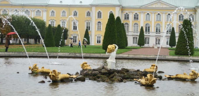 穿过修剪得如绒绒绿毯般的林荫道,彼得大帝的青铜雕像正昂首凝视着远方的海湾,马鞍上的纹饰还沾着阳光的碎屑,轮廓在光影里愈发挺拔,仿佛这位帝王从未远去,始终静静守护着这片他亲手打造的皇家领地。忽然,一阵清脆的水声裹挟着沁人清凉扑面而来,前方的大瀑布喷泉群正全力绽放:几十道银色水柱从狮子、海马等雕塑口中奔涌而出,狮爪下的水花溅起半米高,水雾轻扬;海马的尾鳍凝着剔透水珠,随水流微微晃动;最高那道水柱直冲天际,落下时碎成万千珍珠,在阳光中折射出一道横跨喷泉的绚丽彩虹,赤橙黄绿的光晕漫在空气中,格外耀眼。几个俄罗斯小朋友穿着亮黄色泳衣在喷泉旁追逐嬉戏,湿漉漉的头发贴在汗湿的额头上,笑声像风铃般清脆透亮,与哗哗的水声交织成灵动乐章,给这座庄严肃穆的皇家园林添了满溢的人间烟火气。