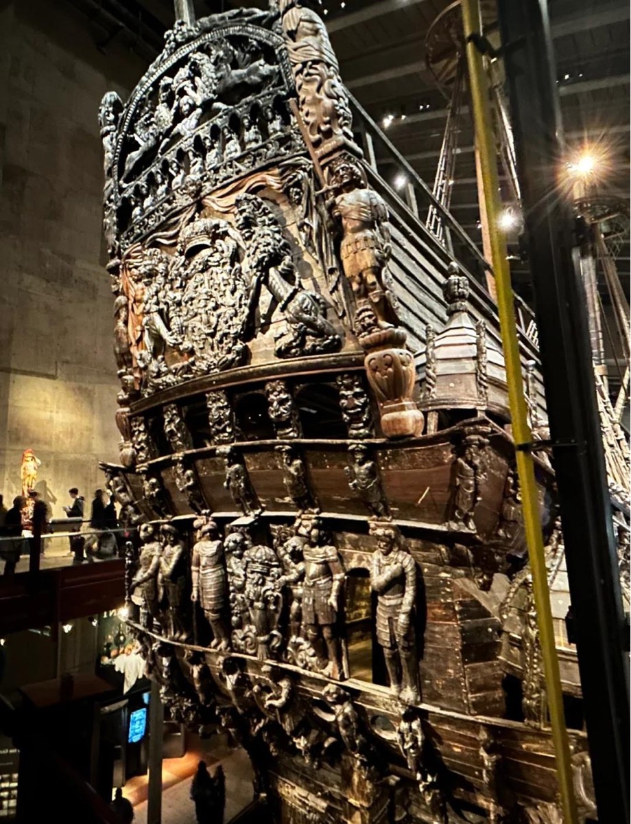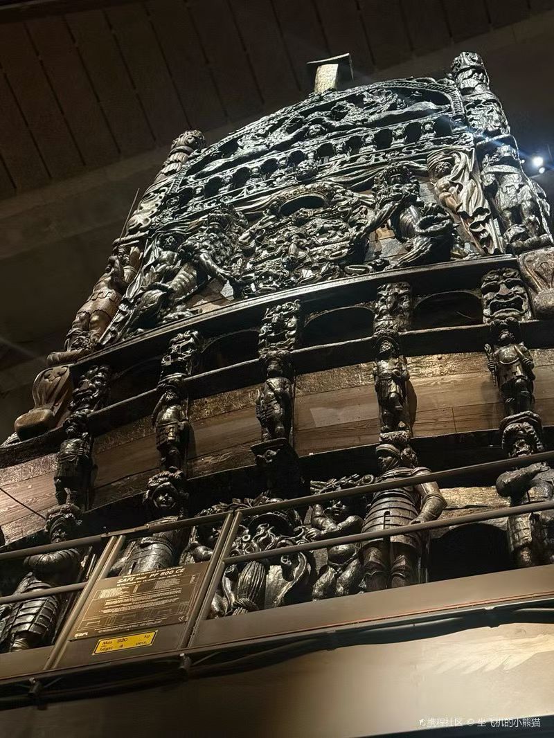 阳光透过展厅的玻璃窗,柔和地洒在深褐色的船身上,历经岁月侵蚀的木质纹理清晰可见,每一道纹路都像是时光镌刻的印记。我沿着博物馆的多层观景台缓缓行走,从不同角度细细打量这艘古船,越看越被古人的工艺所折服。船身遍布着精美的巴洛克风格木雕,人物、神兽、花纹栩栩如生,线条细腻流畅,哪怕经过海水百年浸泡,依旧能看出当年的奢华与精致。这些雕饰不仅是艺术的瑰宝,更藏着17世纪瑞典的航海野心与艺术审美,随手拍下一张雕饰的特写,镜头里的纹路仿佛都在诉说着昔日的辉煌。