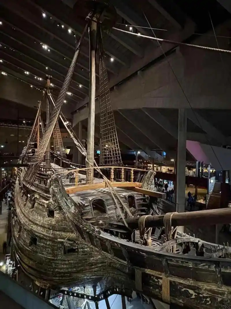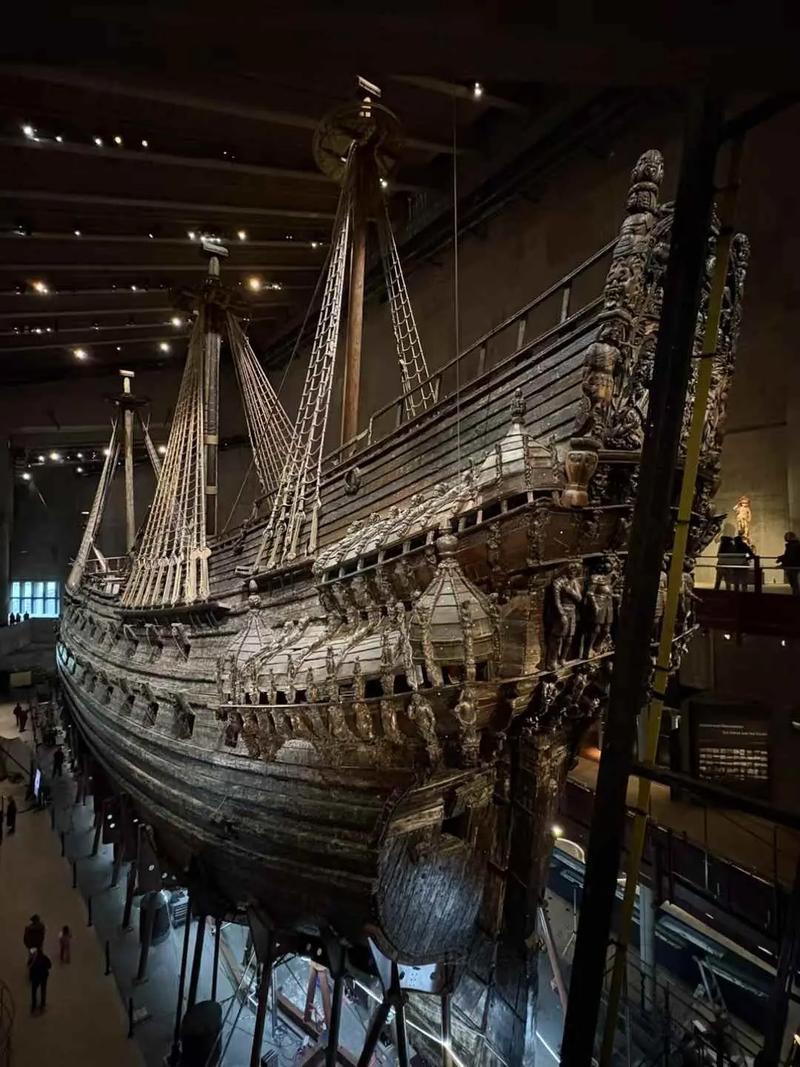 推开博物馆的大门,瞬间被一股静谧又庄严的氛围包裹,周遭的喧闹仿佛都被隔绝在外,只剩下心底的惊叹。当整艘瓦萨号战舰完整地出现在眼前时,我彻底怔住了,手中的相机不自觉地举起,快门声接连响起,却怎么也拍不尽眼前的震撼。这是一艘沉睡了三百多年的古战船,1628年首航仅千余米便意外沉没,在海底静静蛰伏了333年,才被完整打捞上岸,成为世界上保存最完好的17世纪战舰。