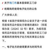关于荆门市基本医保职工门诊 统筹购药使用电子处方的公告广大参保人员:根据《省医疗保障局办公室关于进一步规范医保药品外配处方管理的通知》(鄂医保办发〔2024〕32 号)要求,为规范医保药品外配处方管理,现就我市职工门诊统筹购药使用电子处方相关事宜公告如下一、电子处方的使用要求与时间节点自2025年11月1日起,参保人员在定点零售药店进行职工门诊统筹购药结算时必须取得定点医疗机构开具的电子处方。电子处方将作为定点零售药店职工医保门诊统筹购药结算的唯一有效处方凭证,参保人员务必严格按照规定,凭定点医疗机构开具的电子处方进行购药结算。二、特殊群体的便民服务保障考虑到老年人等部分参保群体对电子渠道的使用需求差异,支持定点医疗机构将电子处方打印成纸质处方。有需要的参保人员可向就诊的定点医疗机构提出纸质处方打印申请,定点零售药店在接收纸质处方后,将按照电子处方流转程序核对信息,协助参保人员完成购药与医保结算,切实保障特殊群体的用药便利性。 ……转自今日头条