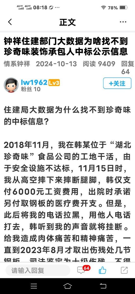 王某远2018年11月15日在韩某指定的“湖北珍奇味”食品公司的工地安装水电时摔断腿脚,支付6000元医疗费,出院时承诺另付取钢板的医疗费开支,但是,韩某开始几个月还能打通电话,但不久直接将王某远的电话拉黑了,无法联系。给王某远造成肉体痛苦和精神痛苦,医疗费等费用都没有着落,多次找到珍奇味,都以“不知道谁包的”而拒绝提供承包人信息。