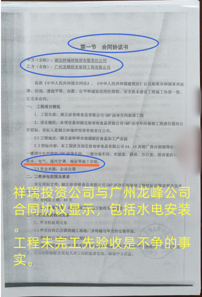 王某远认为,广州龙峰防水装饰工程有限公司是湖北珍奇味食品有限公司 GMP 洁净车间装修工程的合法承包人,韩某、孟某二人因没有合法分包资质,是湖北珍奇味食品有限公司 GMP 洁净车间装修工程的违法承包人,广州龙峰防水装饰工程有限公司将湖北珍奇味食品有限公司 GMP 洁净车间装修工程分包给没有合法施工资质的韩某、孟某属违法分包,应与韩某、孟某二人连带承担相应法律责任。但令人不可思议地是,广州龙峰防水装饰工程有限公司在2018年3月与钟祥珍奇味食品有限公司签订 GMP 洁净车间装修工程协议后,不仅层层非法转包,而且是“未完工,先验收”的严重违规违法操作,经相关部门提供的信息显示,湖北省珍奇味食品有限公司在2018年11月2日已与广州龙峰防水装饰工程有限公司签订了“验收协议”(见插图),验收合格资料上有钟祥祥安建设工程管理有限责任公司、湖北省祥瑞投资有限责任公司、湖北祥瑞产业投资集团有限公司盖章及负责人签字,但是,已经“验收合格”的工程,相隔13天后还在由韩某组织工人安排水电,也就是说,这个打着“广州龙峰防水装饰工程有限公司”的水电安装工程,是先验收合格,后一步还在施工。